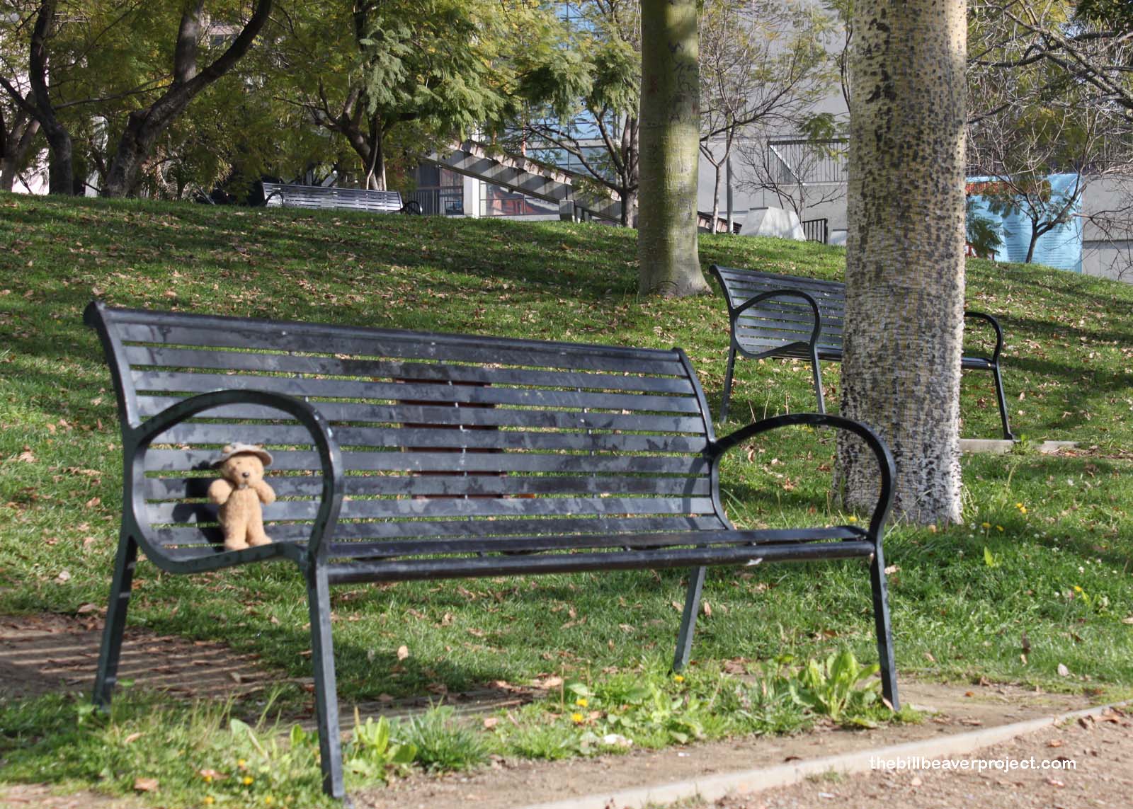 That was my thought as I returned to my original destination. Angel’s Knoll Park is a wonderful patch of greenery overlooking Grand Central Market, the oldest and largest open-air market in Los Angeles, overflowing with great (cheap) food. I skipped past the lackadaisical guard and approached the golden bench, glorious among the thorny silk-floss trees. It even had a plaque on the back to confirm its identity, but no matter how hard I looked, George was nowhere to be found.