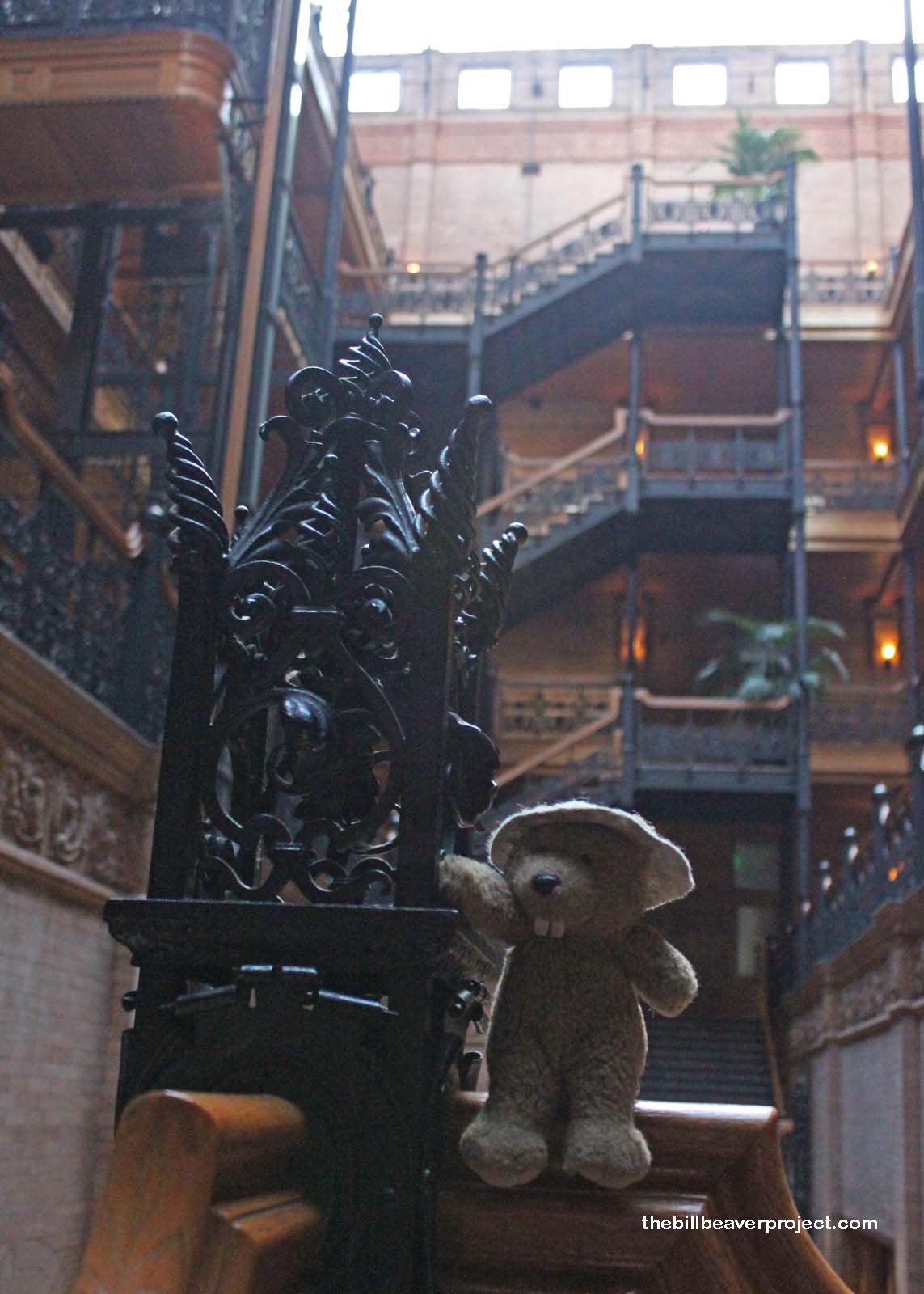 I try not to linger in haunted places. There is a danger of possession, and we beavers do not like to be possessed! Instead, on my way back to Angel’s Knoll, I stopped to see the Bradbury Building, a National Historic Landmark that looks spooky but has no ghostly past. While it is the oldest commercial building in Los Angeles, the Bradbury Building is most known as the setting of such notable films as Double Indemnity, Chinatown, and Blade Runner. Hollywood may be the mecca of all things cinematic, but downtown Los Angeles is home to a more esoteric, even nostalgic, side of cinema.