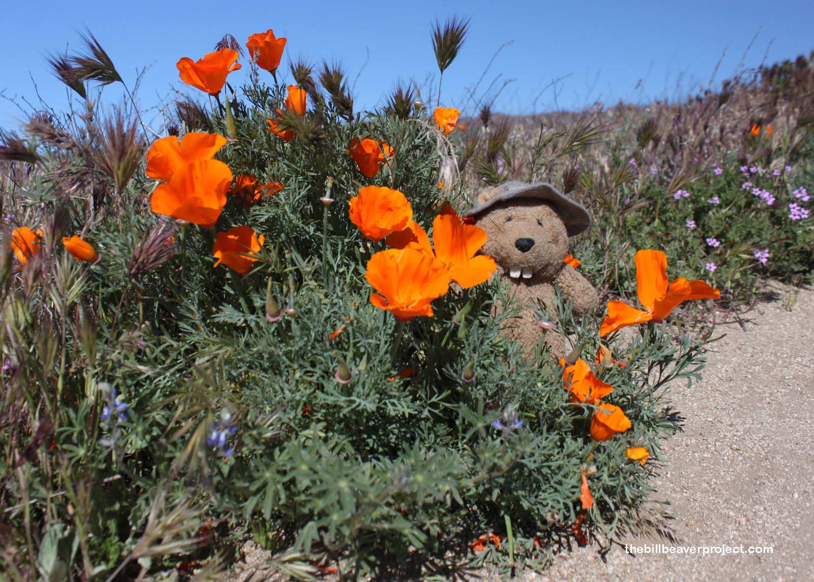 Don’t spread rumors! It’s not nice! When I got to the reserve, there was no orange explosion at all! In fact, the poppies were barely peeking out of the silver grass, and those that were, had bundled up against the whooshing wind that blew my hat off twice! Feeling under-poppified, I hustled along the mile-long Tehachapi Loop, hoping to find a secret blanket of flowers, but alas, it was not to be. That didn’t mean there were no poppies at all, and I did find a patch or two for frolicking, making the trip more or less worthwhile.
