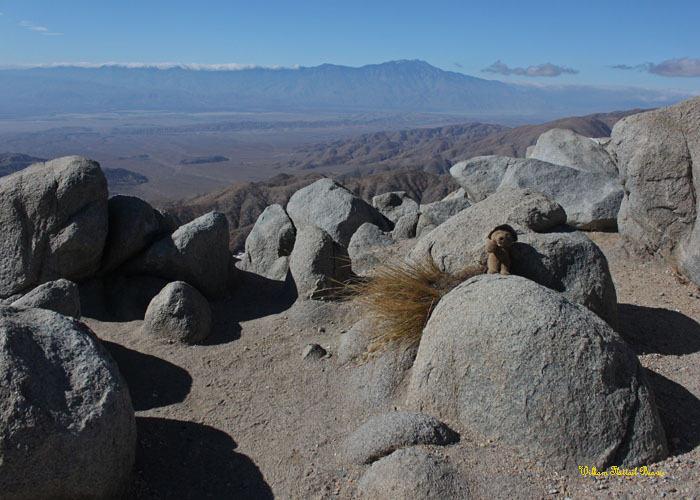 When I passed the wind farm earlier, I was racing some huge, scary clouds, so I made my priority to visit Keys View before they swallowed up the sky. High above the park, Keys View provides some spectacular vistas of the Coachella Valley and the San Andreas Fault, which I visited last month in San Juan Bautista. The clouds, which I thought would be halfway across the valley, had drunk too much water from the ocean and gotten stuck on the San Gabriel Mountains! That meant I could see all the way to the Salton Sea, though it’s rumored you can see as far as Mexico on a clear day! That is pretty rare nowadays, because of all the smog that gets channeled east from Los Angeles. Yuck!