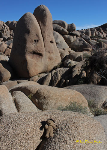 Joshua Tree is home to some fantastic climbing rocks! This is a big reason why it’s popular year-round. There are rocks shaped like faces, oysters, and even croissants, all jutting out of the desert like surrealist monoliths and beckoning the potential climber. I started my adventure at the Hall of Horrors, a series of rock hallways designed for all sorts of climbing levels, and I meandered toward Skull Rock. Skull Rock really does look like a human skull, which is spooky, being so close to the Hall of Horrors. All around it, though, is the most wonderful of rocky playgrounds! I spent hours leaping and careening across the monzogranite monoliths until my leaper was well worn out! When a field of flowers is not available, a boulder field does nicely for a good frolic!
