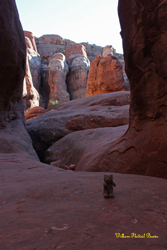 Anyway, I could go on for hours about cryptobiotic crust, but the really critical event of the day was losing my hat! See, after I watched the Fiery Furnace orientation video, promised never to step on the cryptobiotic crust, and got my permit, I got lost! Recently, the Park Service began to remove cairn stones from various areas of the park for not being natural enough. The problem with this is that, when there are no cairn stones to guide a non-native specie like myself, many lost visitors start blazing new trails that, in turn, make it easier for later visitors to get lost too. So, when a well-worn trail leads down a canyon, you’d think it would be a great idea to follow it. That idea only lasts as long as the short, box canyon!