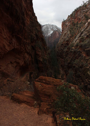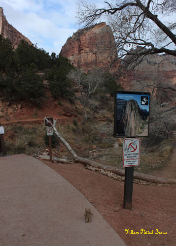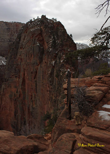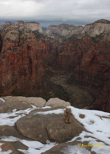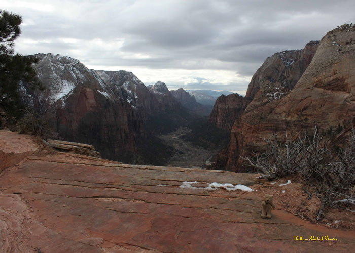 I haven’t had any luck this year finding George, but my other older brother, Woodchuck invited me to spend Solstice with him in the city of Beaver, Utah. Along the way, I made a detour to Zion National Park! Zion offers endless possibilities for hiking, rock climbing, swimming, and general sightseeing, but the most popular pastime of all is to ascend the precarious, 1,400-foot shark fin of rock known as Angel’s Landing. Of course, this is only really popular during the summer when there’s no ice. However, today is December 18th, and as I first caught sight of my destination, it began to snow.