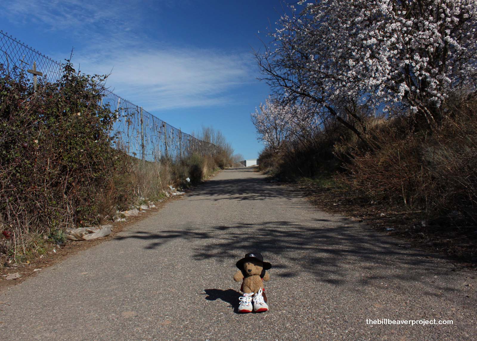 After a good fifteen minutes of frolicking in the water and socializing with the local patos, I resumed the walk to Navarrete, passing clouds of almond blossoms and walking along a chain-link fence to which years’ worth of peregrinos had attached crosses made of sticks! The collage of crosses stretched all the way out of sight! Well, being a skilled manipulator of sticks, I had to join. If you walk the Camino, why not add one of your own?
