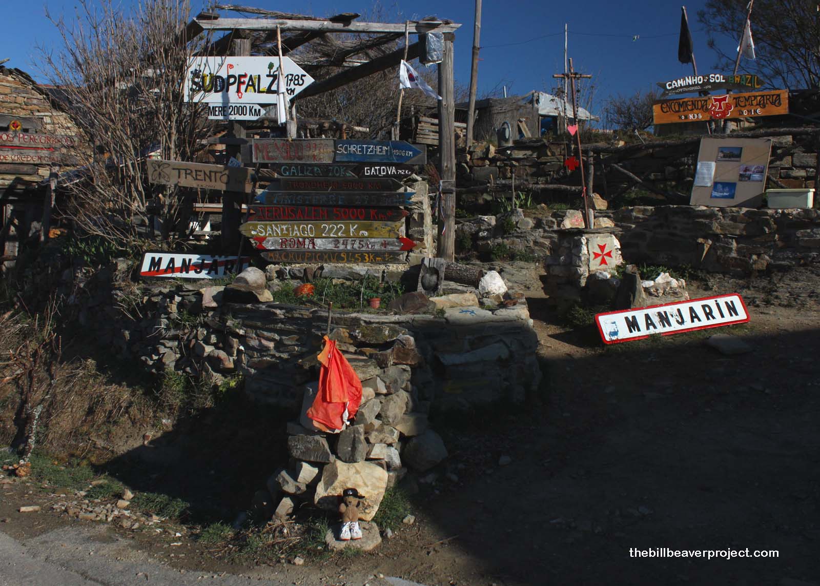 We parted after the Iron Cross, and I continued on my own to what was left of the town of Manjarín. If Foncebadón looked shabby, then Manjarín… Well, in Spain, each town has a sign at the entrance and a sign with a red slash through it at the exit. Manjarín’s were right next to each other. All that’s left of the town is an albergue, sort of like in San-Bol, only colder and without a healing spring. Though I didn’t stay here, I still had to pause at the big sign pointing the way to the world’s other destinations. Just a few moments to imagine… That’s all I need.