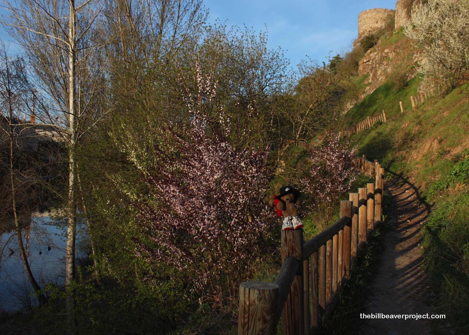 In short, that monk should have taken a stroll down by the riverside like I did! Here, I could see it was Spring, and here, I decided to celebrate Firstbud! True, there have been blossoms all along the Camino, but, since it’s a beaver holiday, Firstbud must be celebrated by the water! Down by the Río Sil, the trees were blazing with color! Even though I’d been walking all day, I just had to do some skipping, followed by a swim! When you’re away from home and family, that’s about all you can do for Firstbud. Too bad there are no messenger albatrosses here.