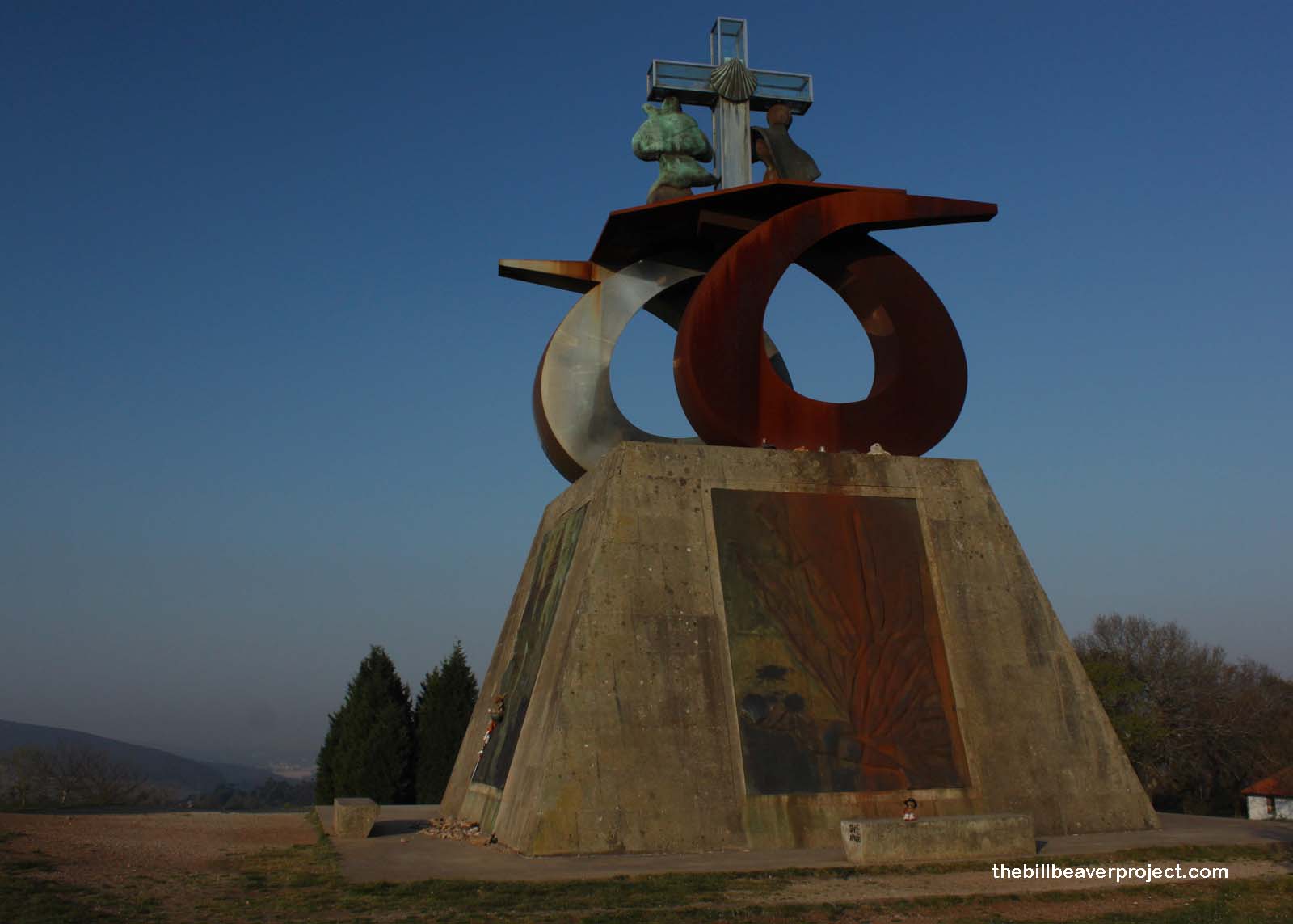 After a trek past a campground and the TV Galicia station, I arrived at Monte do Gozo, the Mountain of Joy! This hill used to be the place where peregrinos would see the towers of the cathedral for the first time, but when I got there, the wildfire smoke and the size of the trees in the foreground prevented me from seeing anything at all! That wasn’t very joyous, but at least there was a neat sculpture to commemorate Pope John Paul II’s visit to Santiago in 1982. It also featured a depiction of St. Francis as a peregrino, which won favor from me!