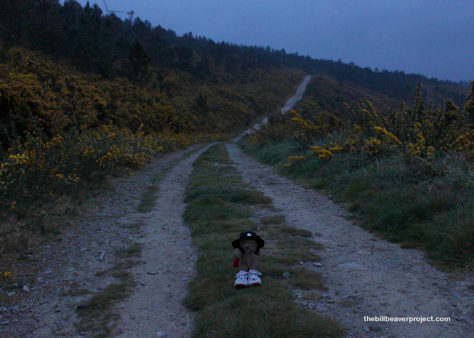 This was the most beautiful morning of the Camino! I started before dawn and headed into the mountains, as the stars fell through the clouds and became windmill lights on the peaks, then trickled down to a lake below me and became boat lamps! As the morning brightened, the slopes around me were draped in a golden aulaga blanket! The sky was overcast and the weather cool and misty, which combined with the lights in the distance and the soundtrack of the songbirds to make these misty mountains magical!