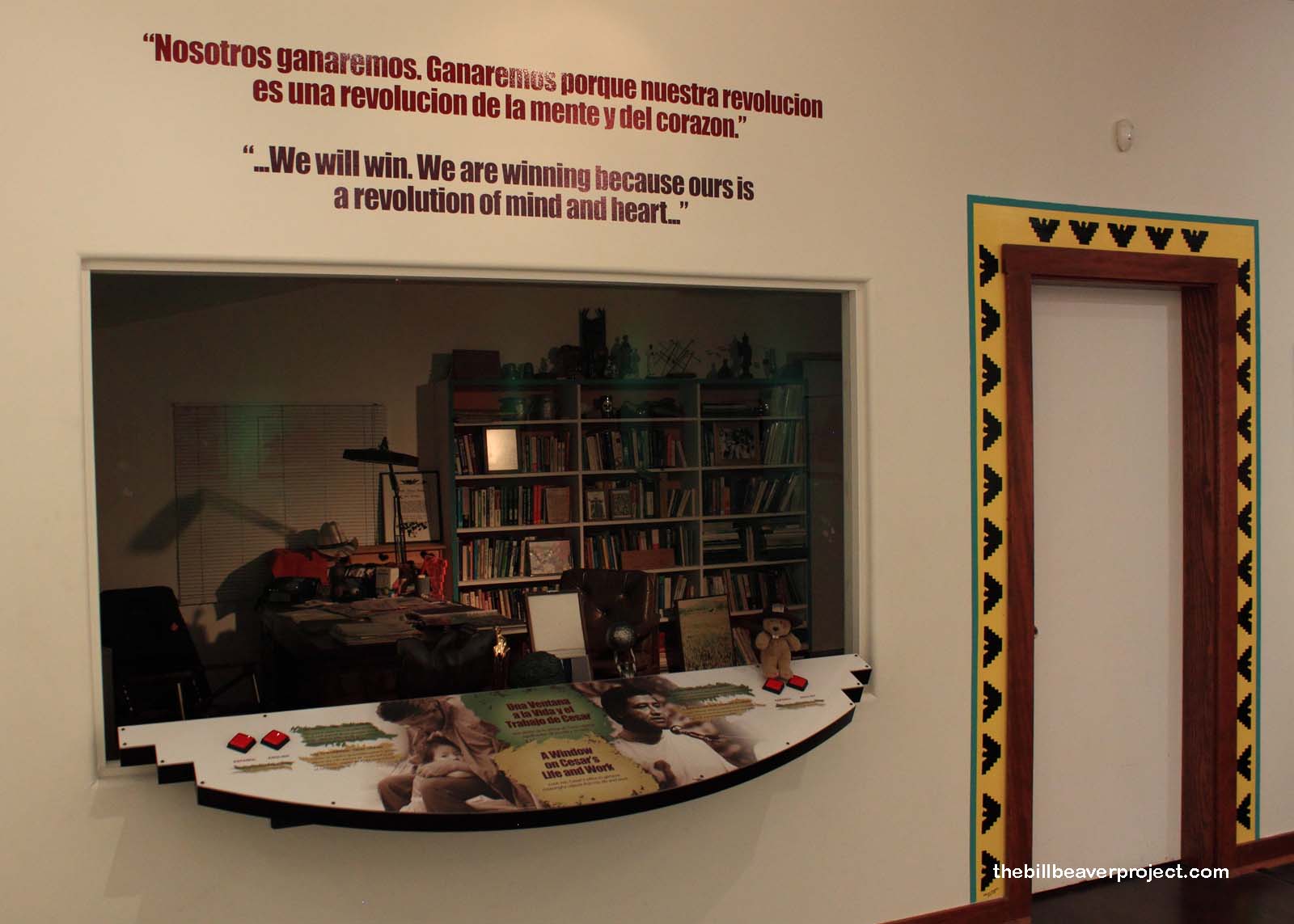 In any case, according to the lady in the visitor center, the reason this location came to be a monument is that there is already a César E. Chávez National Historic Landmark in Delano! However, that’s the site of Chávez’s most significant strike (huelga) in 1965, and it’s called Forty Acres, not César Chávez! Hmm… Whatever the reason for its naming, this monument celebrates Chávez’s life and work through the preservation of his headquarters. His office has been kept intact, from his bookshelves to the mess on his desk, to the special chair he needed to alleviate his intense back pain from years of working stooped over in vineyards. To save his fellow workers from the same sort of pain, among other pains, he spearheaded the founding of the United Farm Workers labor union!