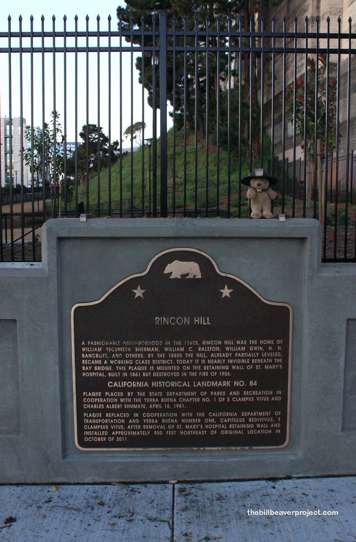 I got off the bus with an aching neck and an important lesson: when driving overnight, pick the most comfortable seat, not the one with the best view. The window seats didn’t recline, so I had to curl up and hope nobody sat on me. That can disturb a beaver’s slumber for sure! MEGABUS arrived in San Francisco half an hour early, which was encouraging, and, making a split decision, I reversed my original route to see the majority of the landmarks up front, just in case there should be a setback. All started off smoothly as I passed through the land of the homeless to Rincon Hill (#84), the first of many landmarks to have been demolished by modern pursuits. San Francisco is pretty thorough with commemorating places, but on this tiny peninsula, there isn’t a whole lot of room to set aside historic parks.