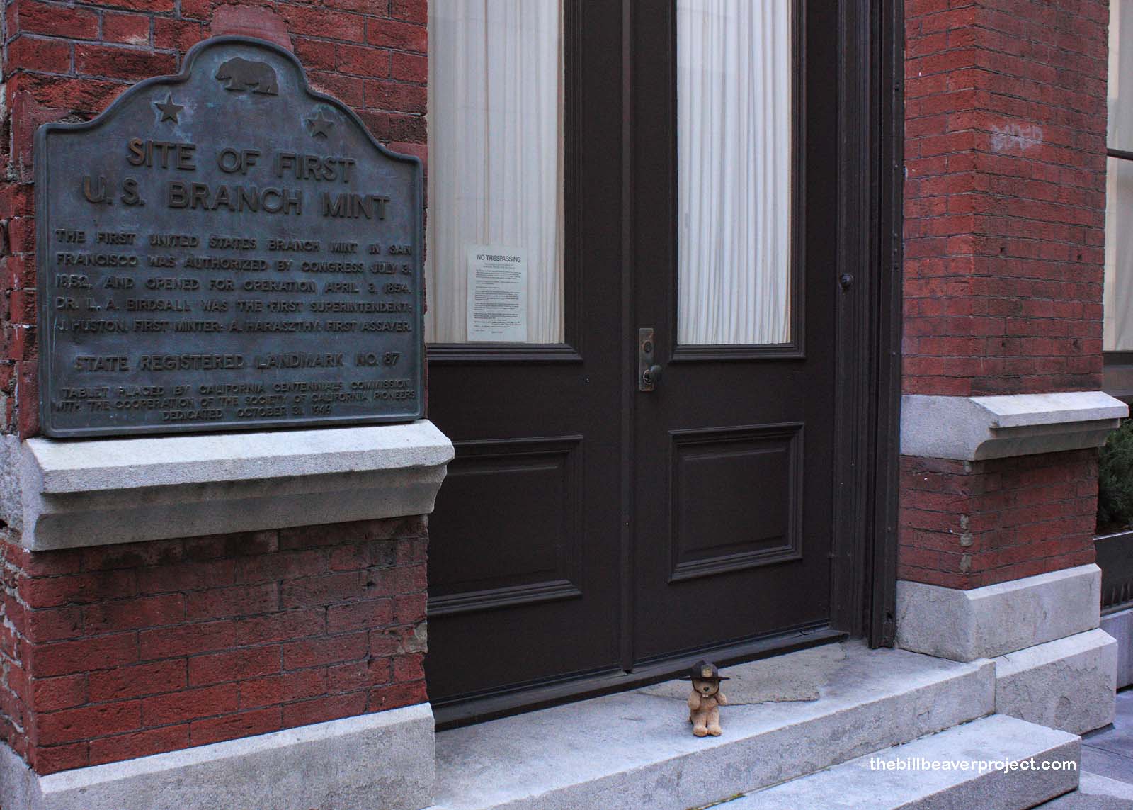 That’s how I got introduced to the interior of the US Branch Mint, with one original wall still intact after the 1906 earthquake and some of the Mint’s original silver dollars downstairs in the vault! There was a fascinating exhibit about Chinese-American students returning to the villages of their grandparents, and though intrigued, I left without a single clue about the Mellus and Howard plaque, only that the building occupied the same general site as the Mint. So, I improvised!