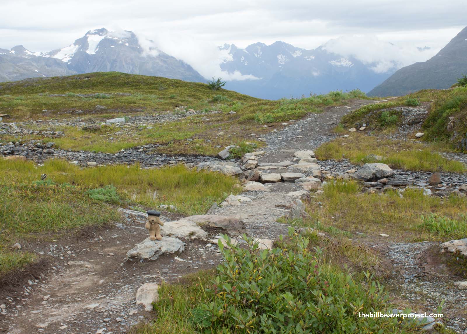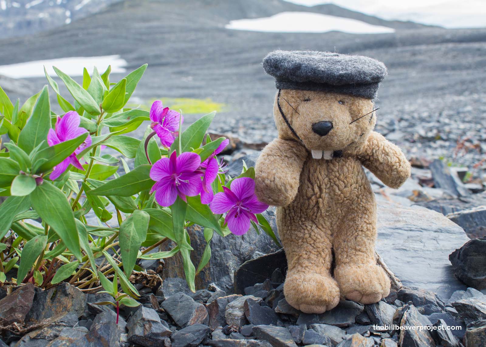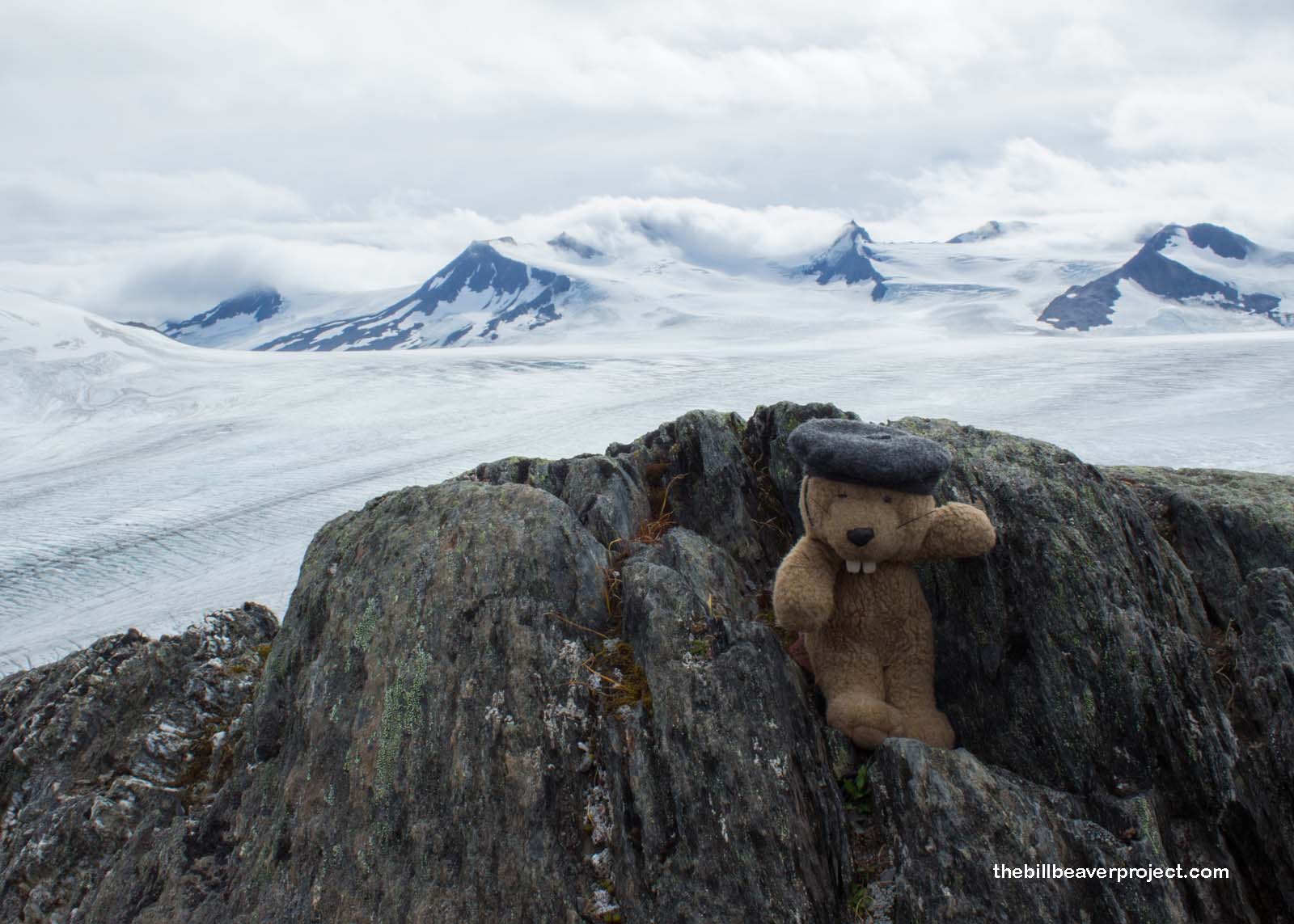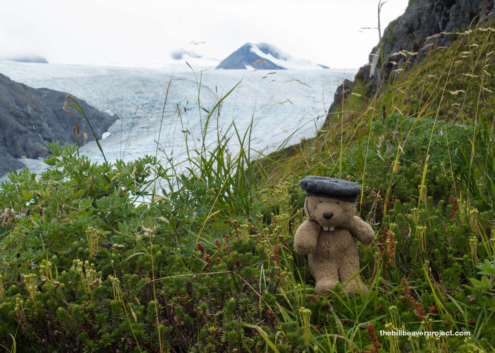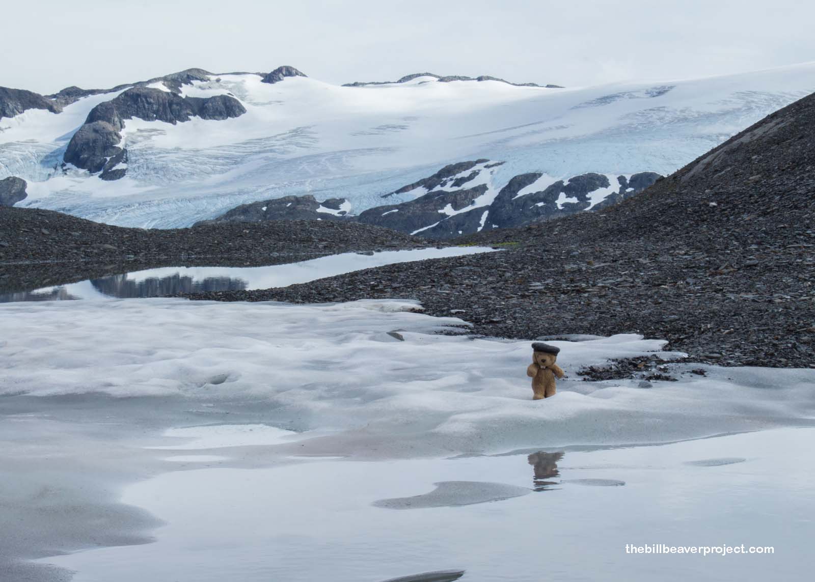 The packing snow was surprisingly scarce up here, but I found just enough to bring back an old friend to share the view. Señor Castorieti came back in miniature, like Exit Glacier, but he was very happy to be up here in the snowy heights! I learned from him that this icefield stretches for 700 square miles and is the mother of over 30 glaciers!