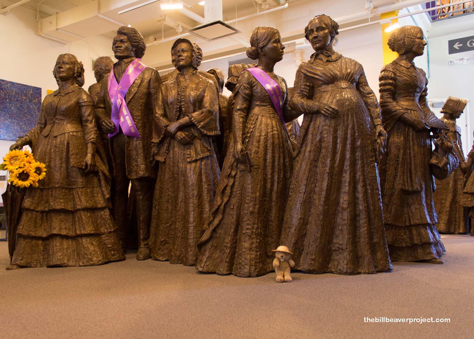 After exploring some of the exterior sights, I headed into the visitor center to learn more. I was greeted at the door by twenty bronze statues of the first attendees at the conference. Not all of the statues in “The First Wave” come with names, but you can spot Mrs. Stanton and Mr. Douglass on the far left and a very pregnant Martha Wright right over my shoulder!