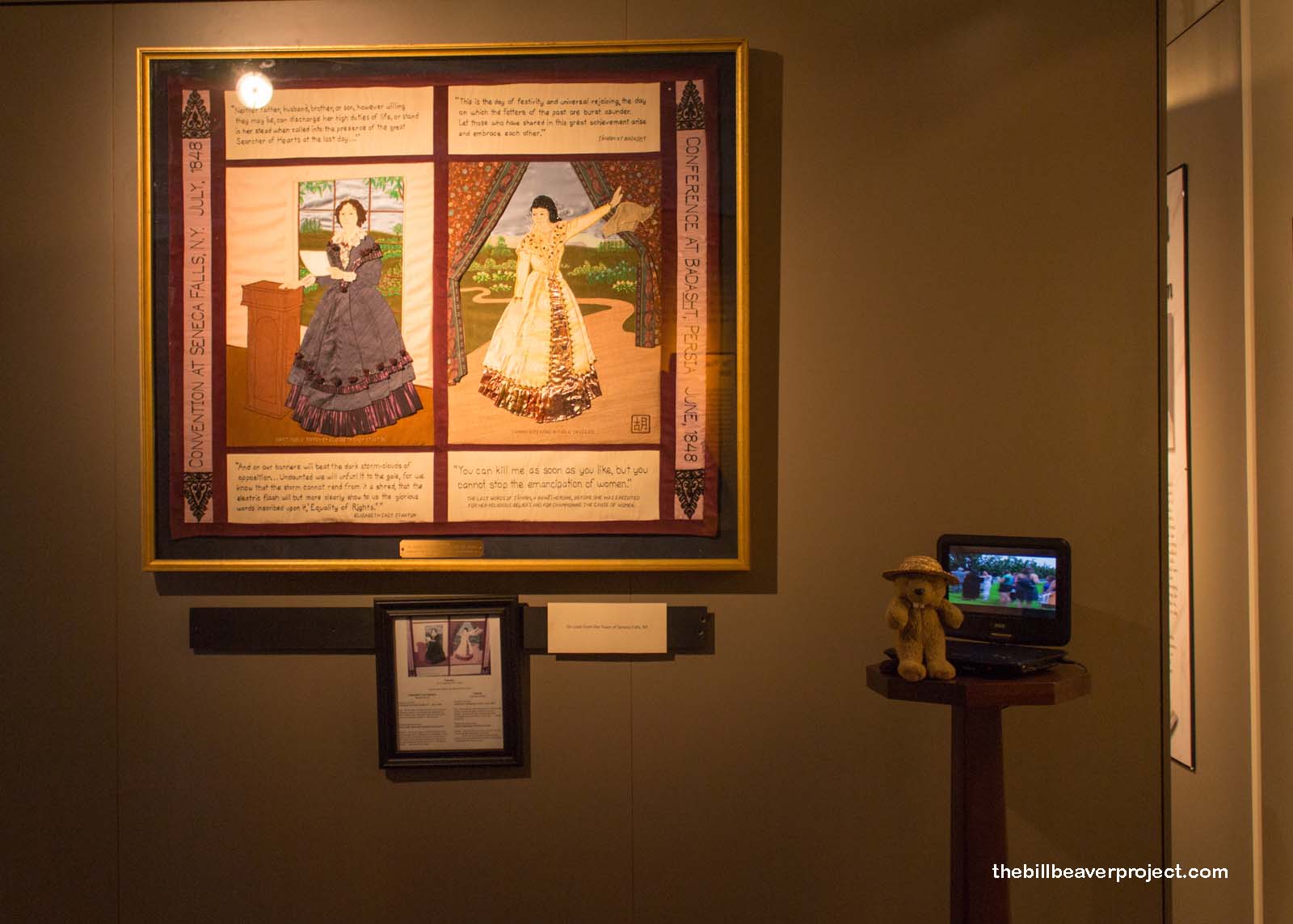 Nearby, a quilted tapestry honored Persian activist, Tahirih, a Baha’i who drew inspiration from Mrs. Stanton and launched a campaign for rights in her own country. She appeared before a conference of men and gave a moving speech about abandoning old views, but all that resonated was that she had given this speech without a veil. She was executed for her beliefs in 1852.