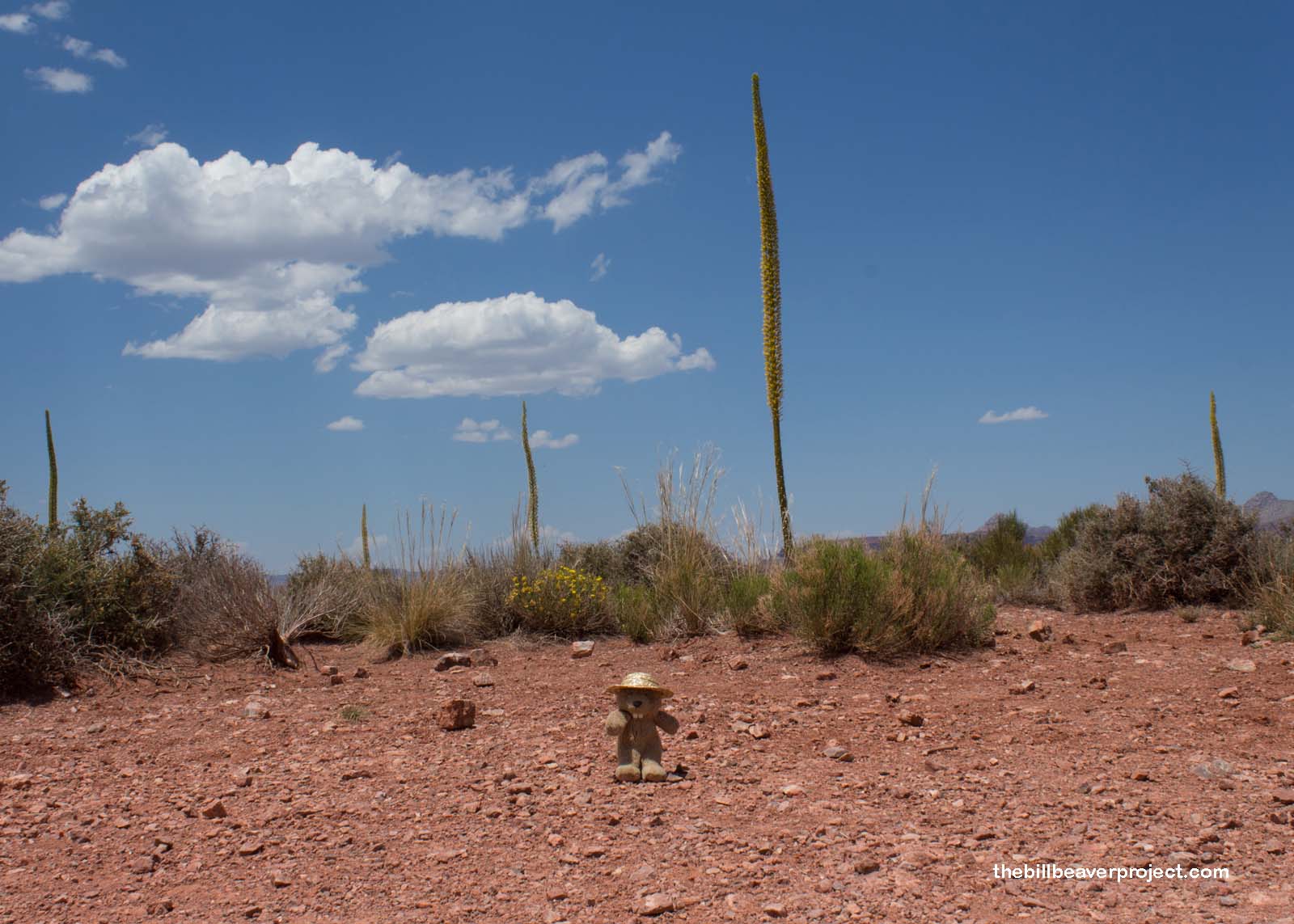 At this point, the crowd really thinned out, and I was left by myself for long stretches to enjoy the desert silence between wind rustling the brush. Some cruel person had installed stairs on this section of trail, which weren’t bad going down, but I knew they would be trouble on the way back up! As I got lower, the plants changed, and I entered yucca blooming season! The yuccas here looked like space plants in an alien world!