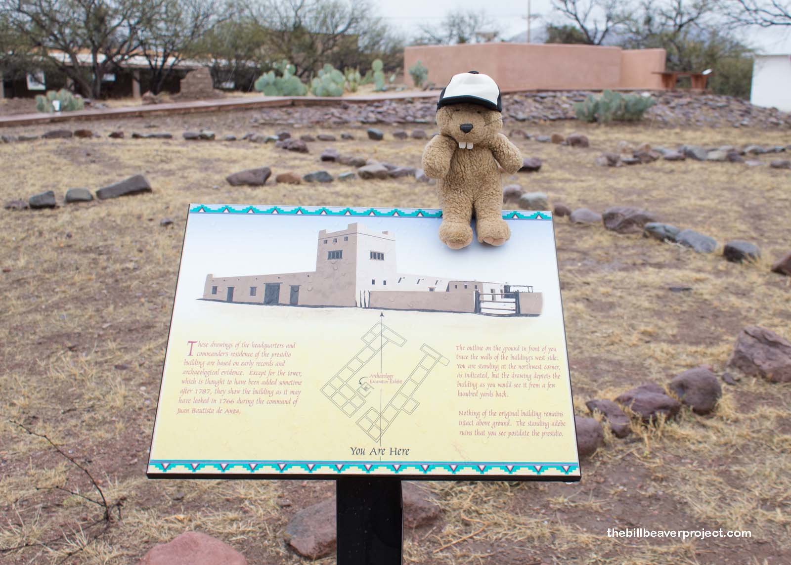 By this point, the rain and wind had really started to pour, but the site was so important to Arizona and California history that we had to tough it out! Sadly, there wasn’t much to see aboveground. Years of weather and neglect have pushed the last remains of this presidio, one of only two surviving presidios, underground. Within the walls of the old presidio are many mysteries, such as why there is a wide layer of charred earth midway down. No one is sure why the presidio would have burned!