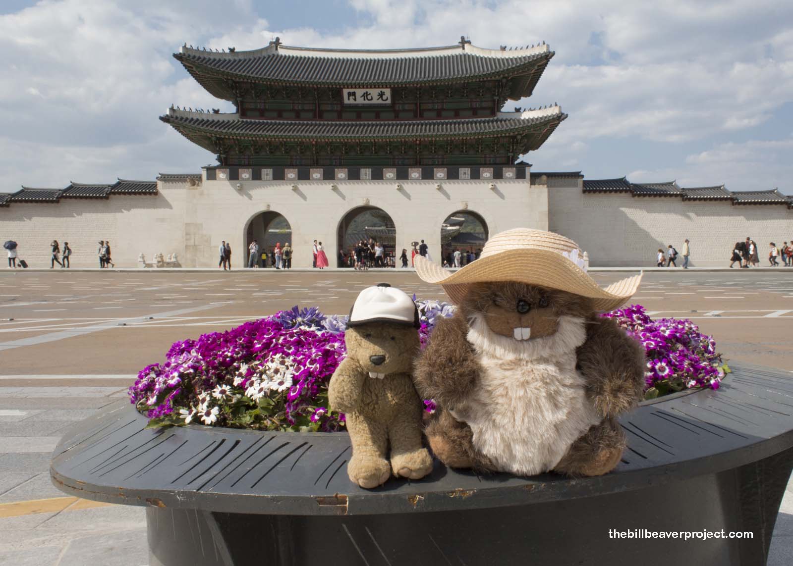 We wandered west down the hot sidewalk, snacking on some tasty red bean buns from a street side bakery handing out samples. Flowers bloomed abundantly on all sides, and while folks were out in abundance, I was surprised that the crowds were not as suffocating as I expected. That changed when we got to Gyeongbukgung!