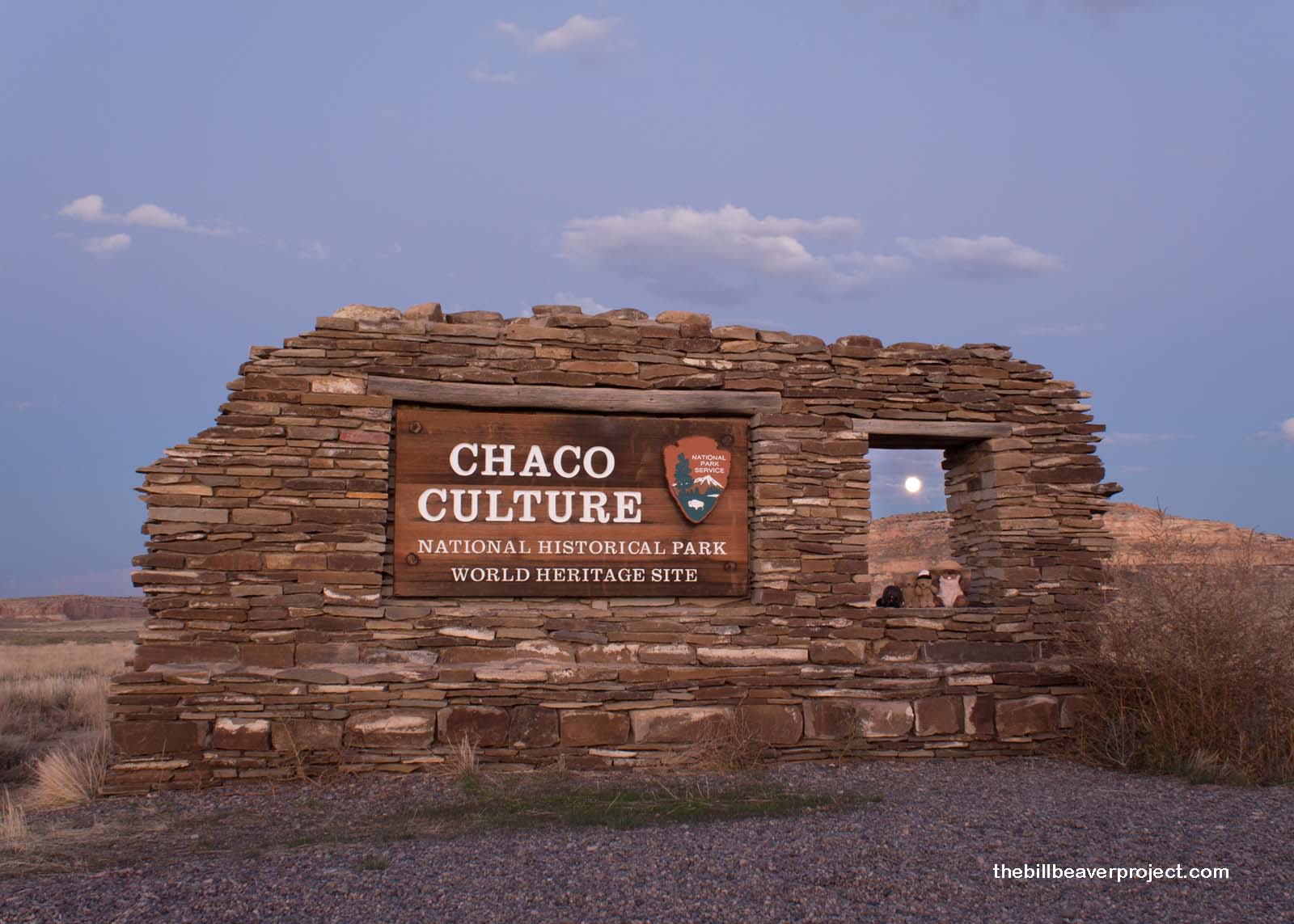 Then, we crossed over into New Mexico, winding our way up to the famous pot-holed road leading to Chaco Culture National Historical Park, a UNESCO World Heritage site. The sun set right as we entered the park, and the full moon rose right behind the sign!