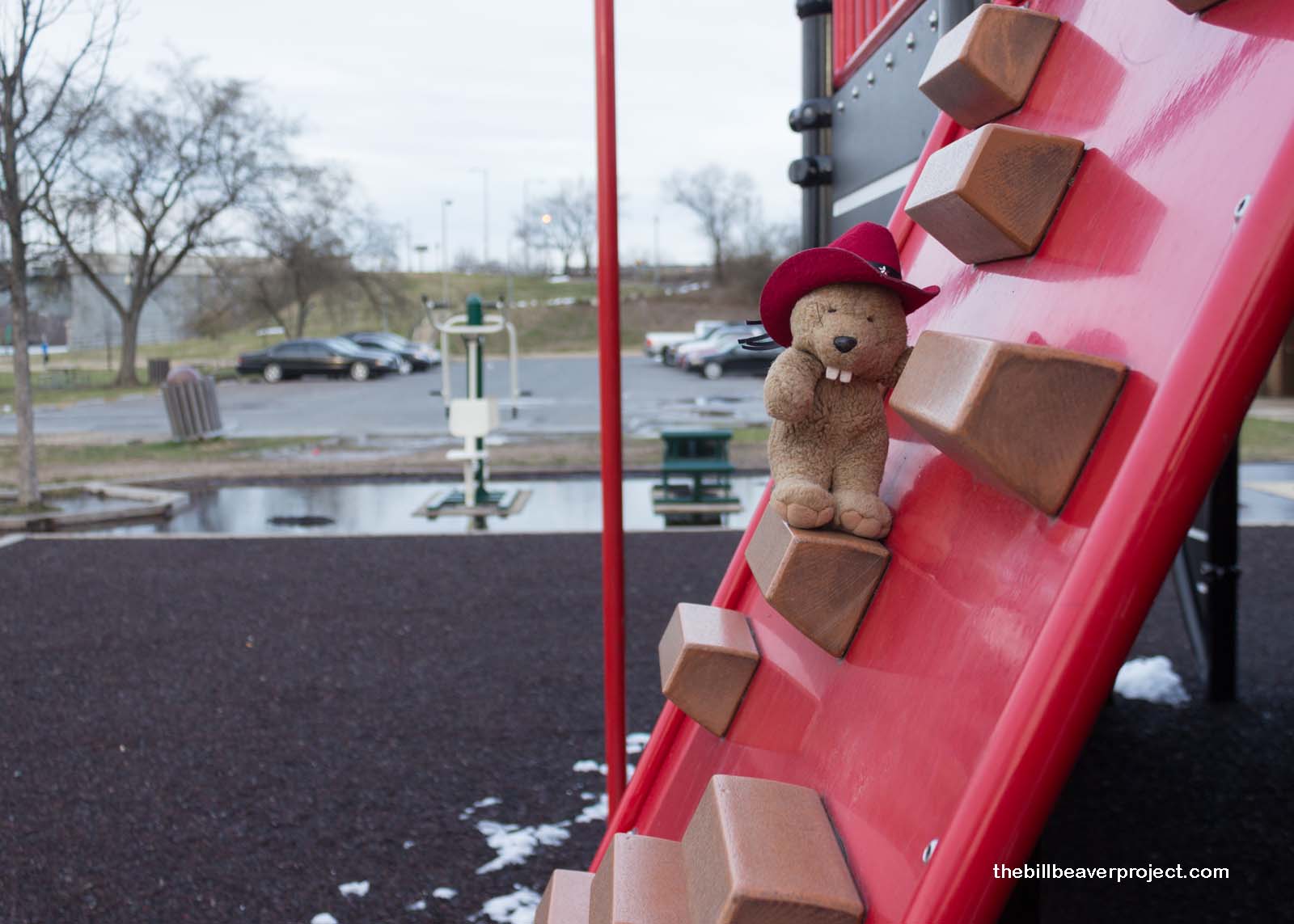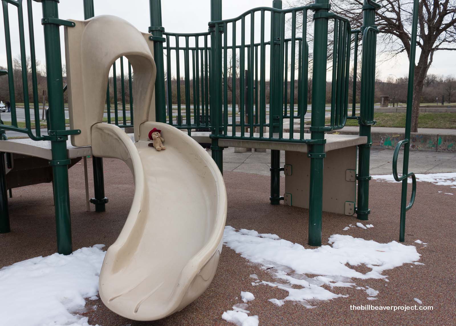 Not to be put off by the gloom and cold, I decided to work up some body heat! This stretch of park along the river is dotted with playgrounds, and even though there wasn’t really anyone else around, I took at least a couple of minutes to climb and slide, if only just to restore feeling to my paws!