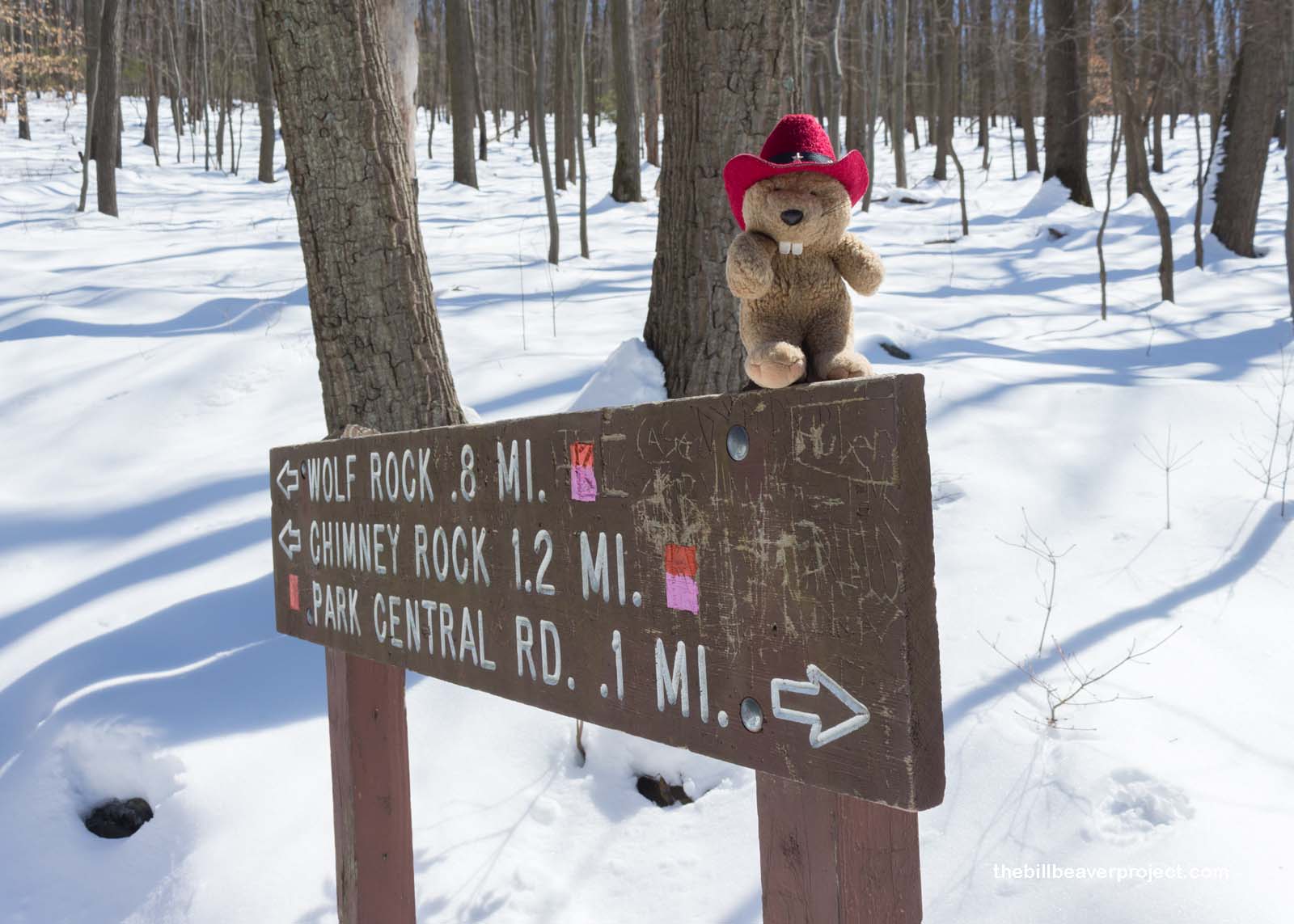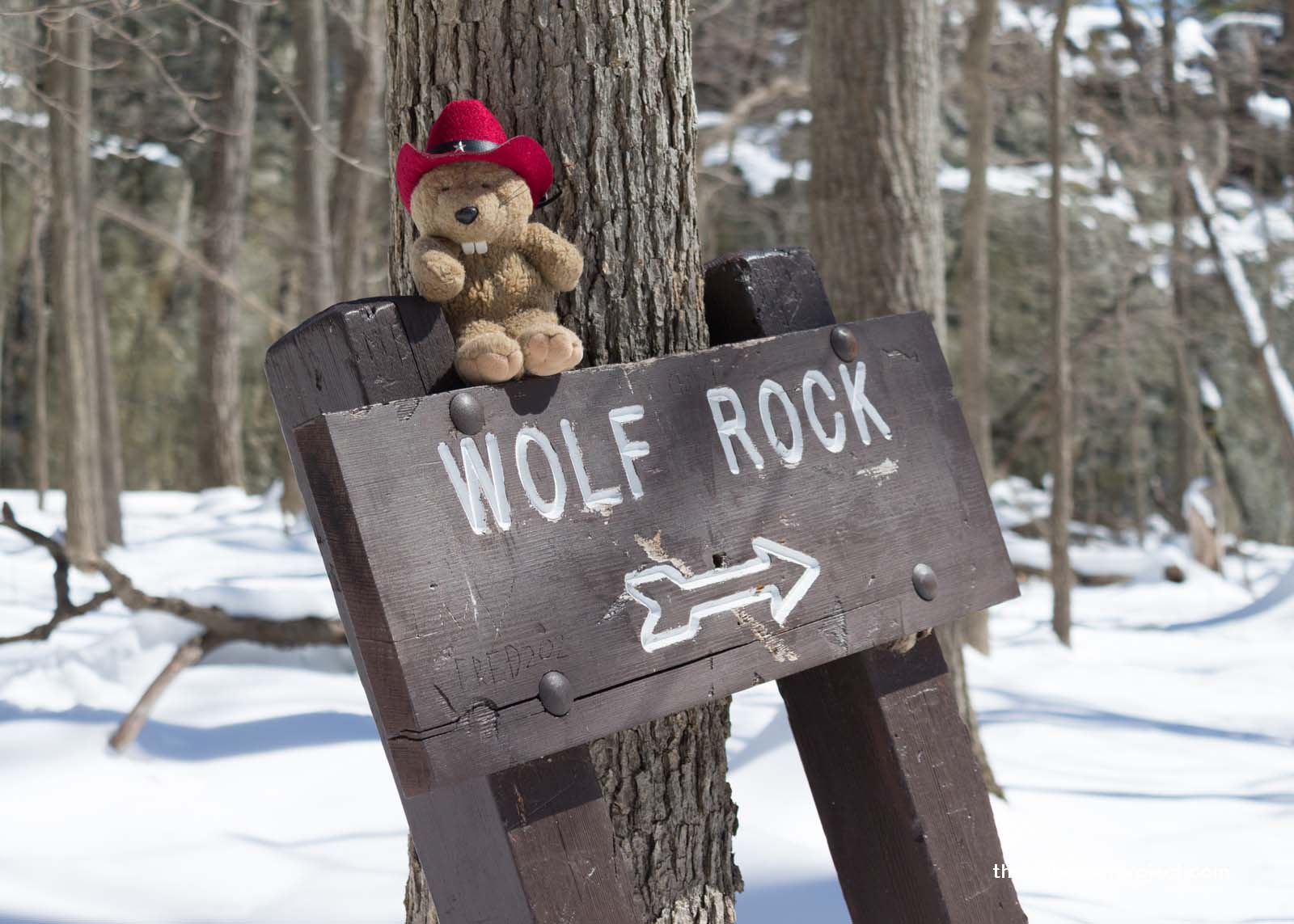 After a mile and a half, I came across a sign for Wolf Rock, which at first made me nervous. What if it got its name from a pack of wolves living nearby?! But then I saw an informative sign with photos. The rock up ahead was just shaped like a wolf and would not actually try to eat me. Of greater concern, though, was the path to Wolf Rock! It was a snow-covered scramble that required leaping rock to rock, and testing the spaces ahead to make sure I wasn’t leaping into a chasm that was just covered by a thin layer of snow! It was pretty darn perilous, but I was glad for the footprints of someone who had come before me!