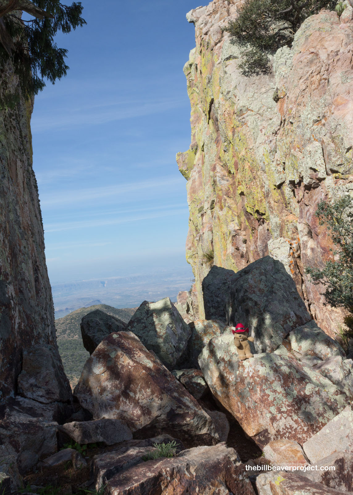 That’s when I looked across the chasm and realized I’d climbed up the wrong rock! So I scrambled back down and maneuvered my way up the other side. This ascent was more strenuous, but it was very comforting to be climbing the opposite side from the sheer drop, with lots of trees to break a fall should one occur!