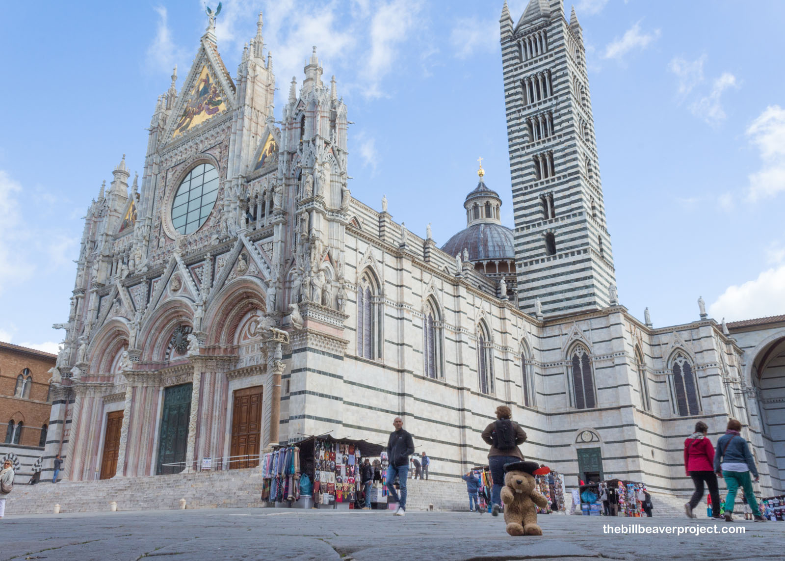 Not far away stands the breathtaking Duomo of Siena, hard to photograph in its entirety because it’s in such a confined space, but nevertheless extraordinary to behold in all its stripey splendor! Built between 1215 and 1263 AD, its black and white marble stripes commemorate the black and white horses of Siena’s legendary founders, Senius and Aschius! Rumor has it that they were the sons of Remus and nephews of Rome’s founder, Romulus!