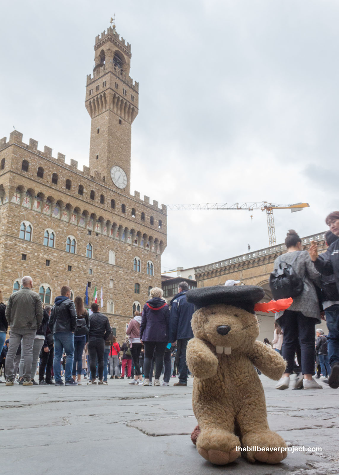 I shoved my way back out of this narrow street and made for the nearest plaza, which happened to be in front of the Palazzo Vecchio, the equivalent of Florence’s City Hall! It was built over a Roman amphitheater in 1299 by Guelphs who had just routed their Ghibelline rivals! It has been a city council meeting place and a Medici residence, but today, as a museum, its biggest draws are its secret tunnels and the hall painted on one side by Da Vinci and the other by Michelangelo! Unfortunately, it, and the Uffizi Gallery, were as jam-packed with people as the other places, so I didn’t get to explore the insides.