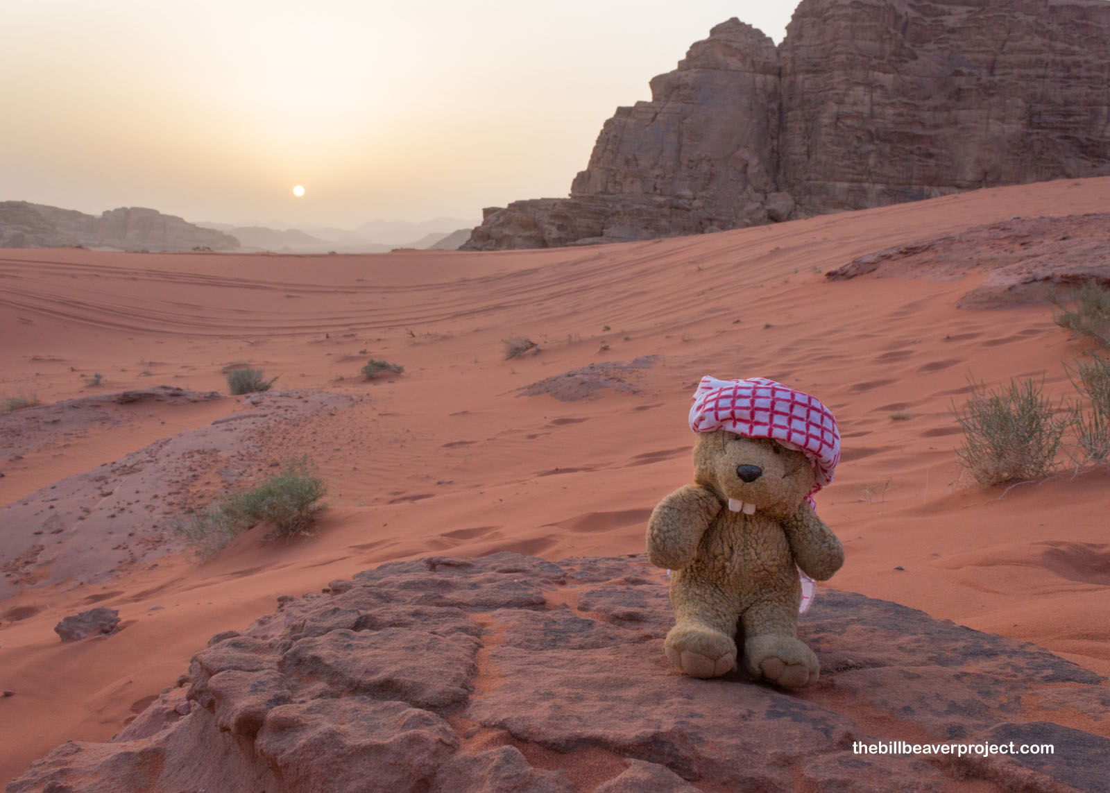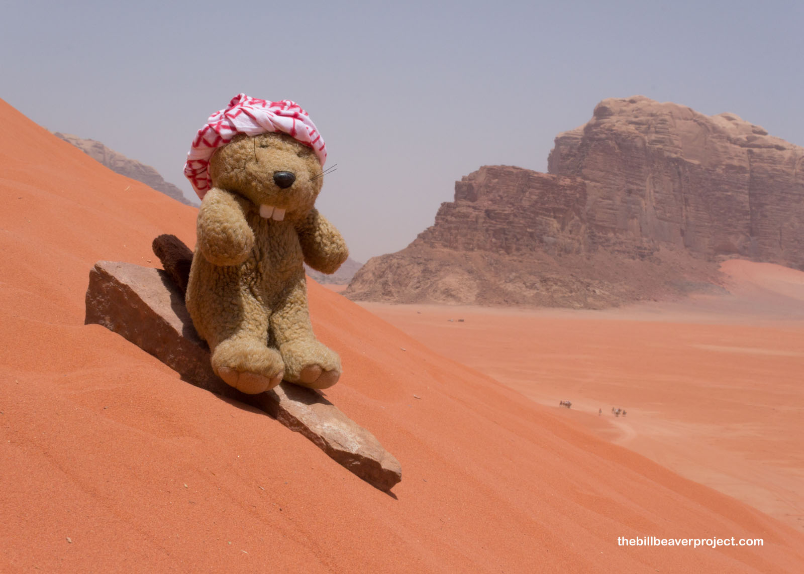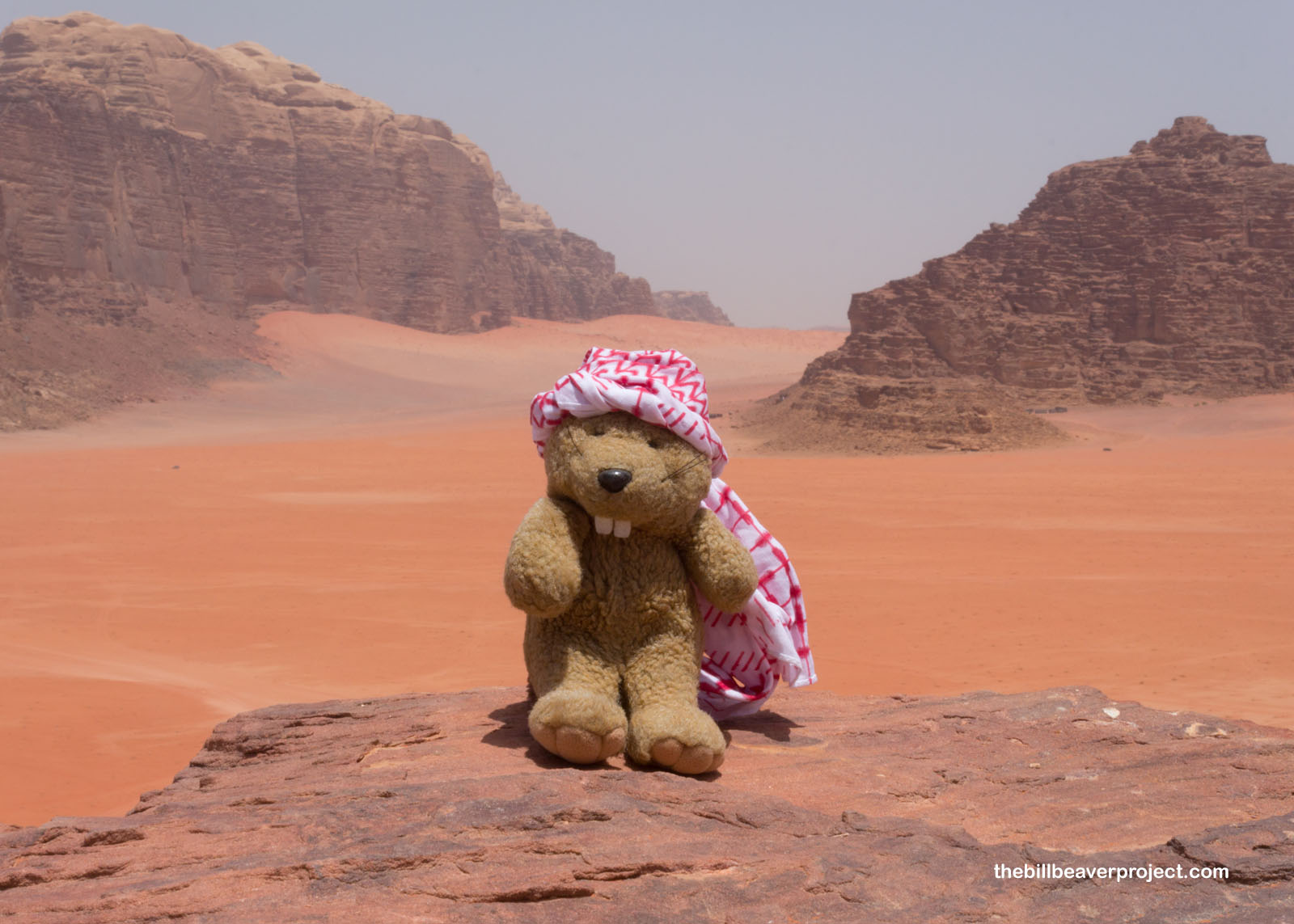With my handmade keffiyeh wrapped around my head to protect me from the sun and heat, I headed south on the amazingly bleak Desert Highway. I learned a lot on this nearly four-hour drive, like how lanes are optional but police are very vigilant! I learned the hard way that this highway comes with very large speed bumps! I also learned how much fun it was to see camel crossing signs and the many different styles of local mosques. Then the mountains of Wadi Rum appeared in the distance through the morning haze, and I heard the call to adventure!