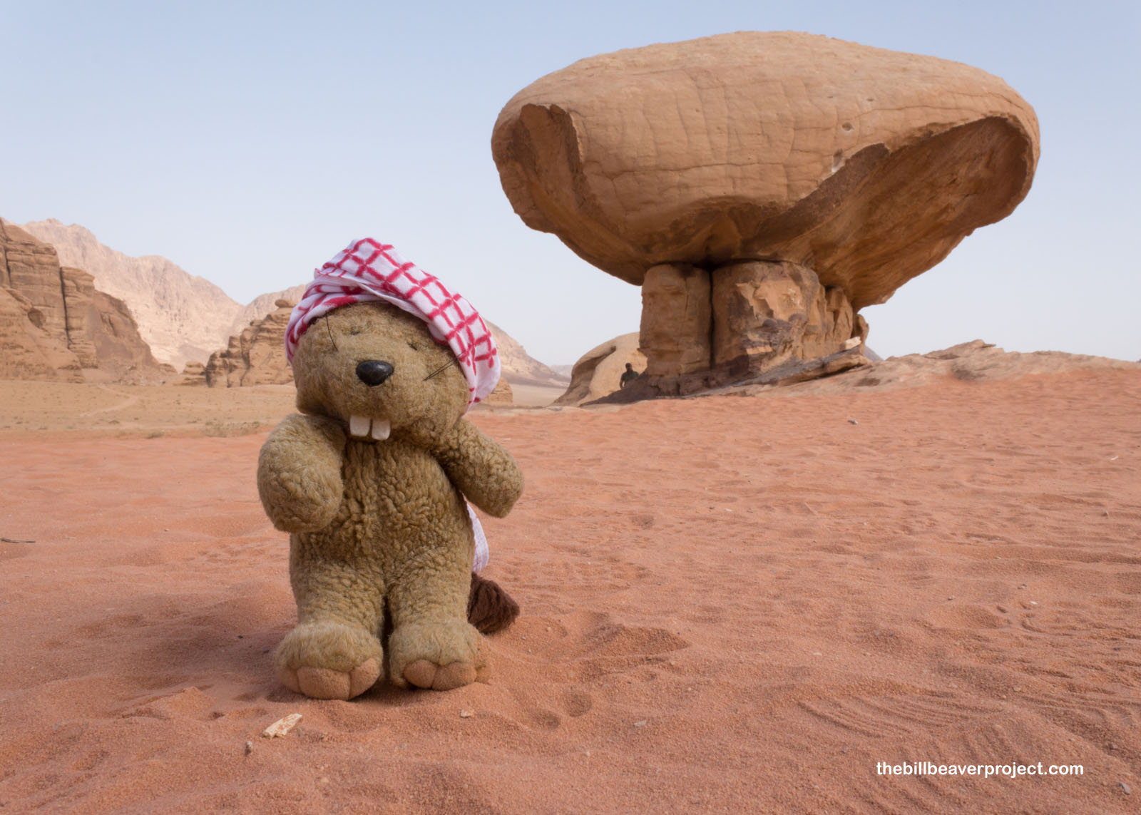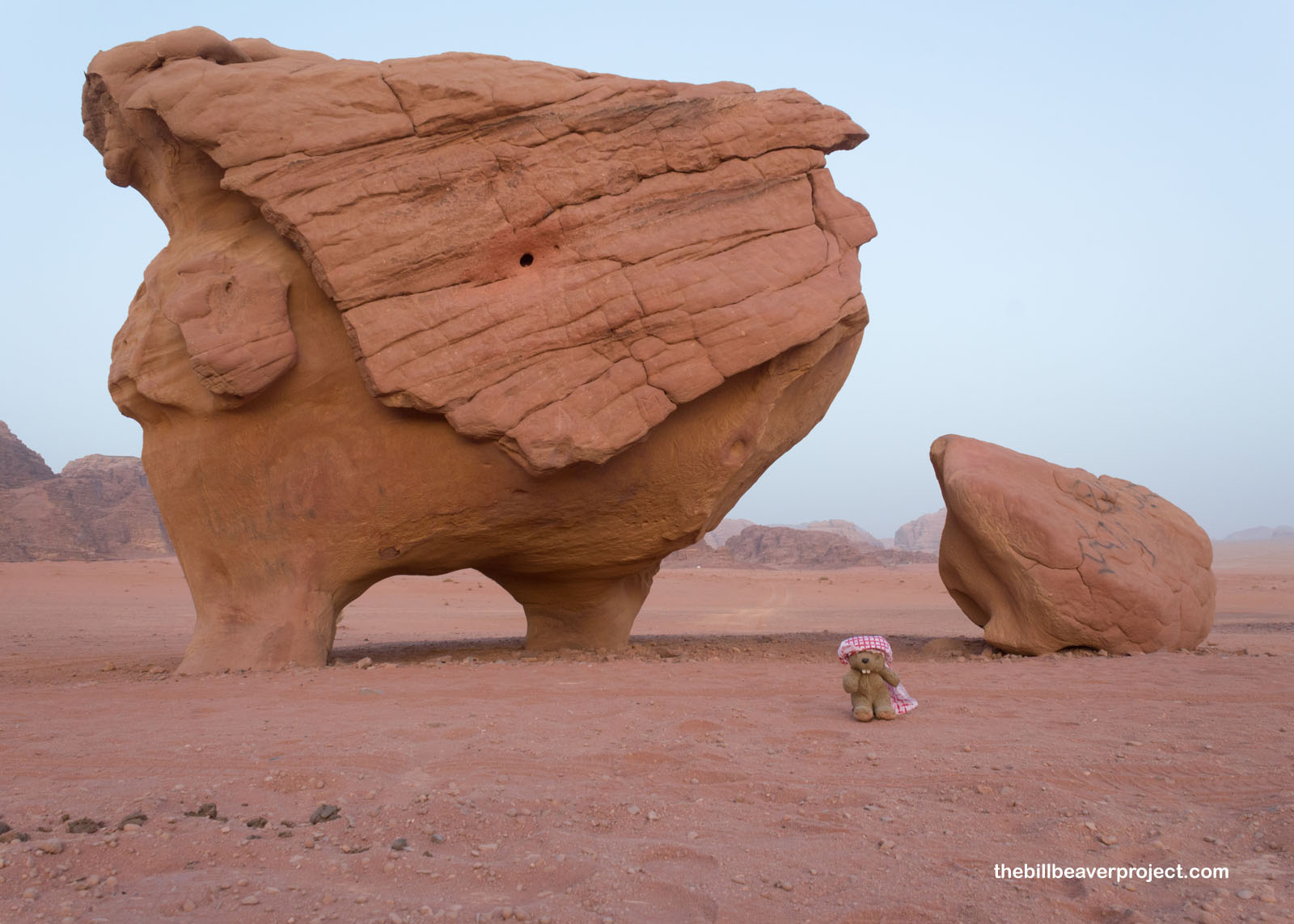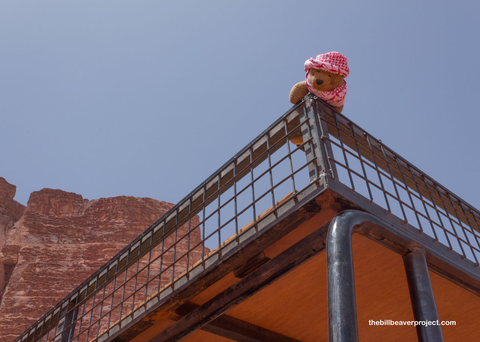 With my handmade keffiyeh wrapped around my head to protect me from the sun and heat, I headed south on the amazingly bleak Desert Highway. I learned a lot on this nearly four-hour drive, like how lanes are optional but police are very vigilant! I learned the hard way that this highway comes with very large speed bumps! I also learned how much fun it was to see camel crossing signs and the many different styles of local mosques. Then the mountains of Wadi Rum appeared in the distance through the morning haze, and I heard the call to adventure!