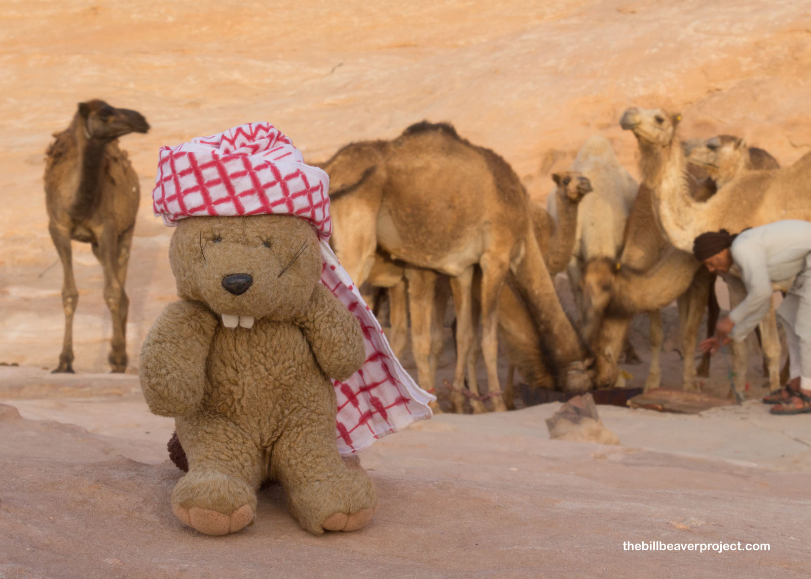 As the sun got lower, we stopped for a water break, not for us, but for the local camel herd. Khaled took us to a spring and started filling a trough with buckets of water. It was like a dinner bell, because camels started to appear from all over, slipping and stumbling on the sandstone to get a slurp of precious water! Though camels can survive without drinking for up to six months, they’ll take any chance they can get to stock up!