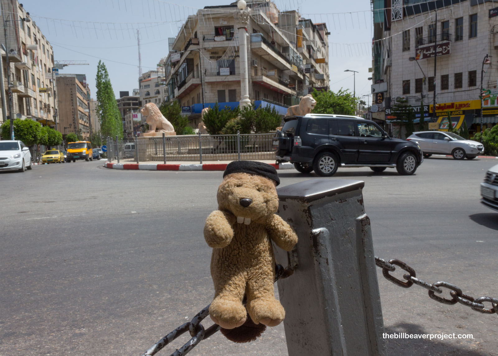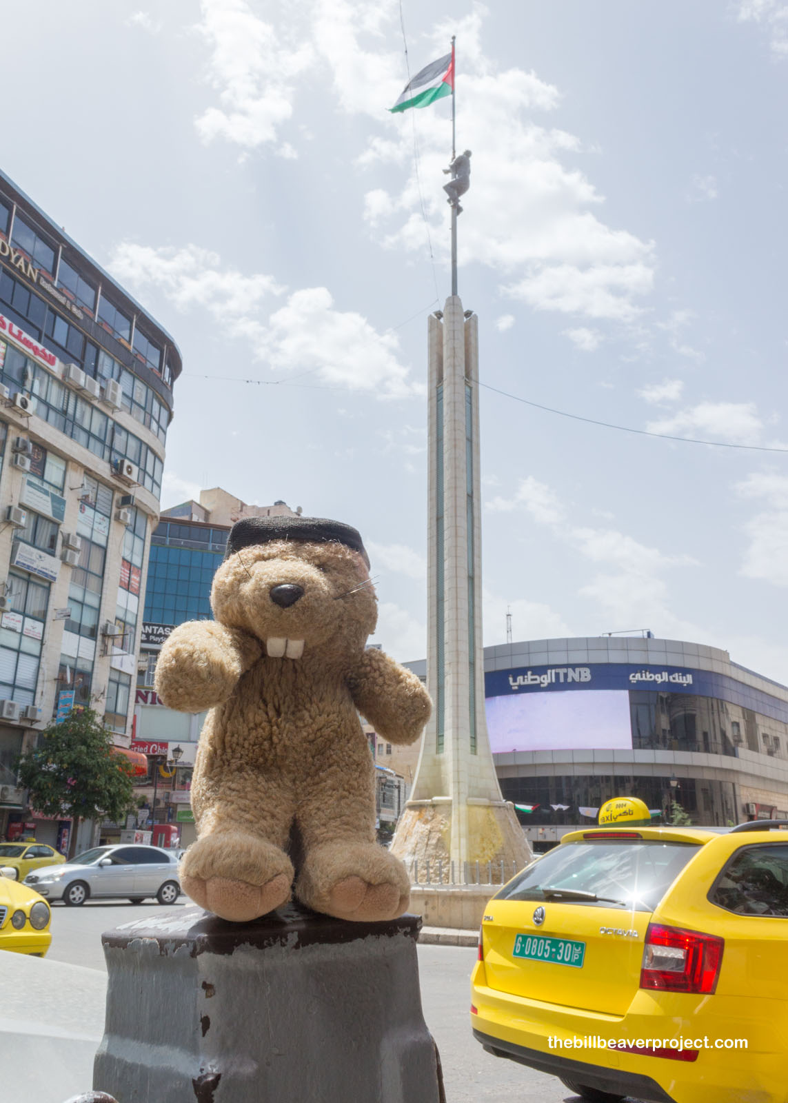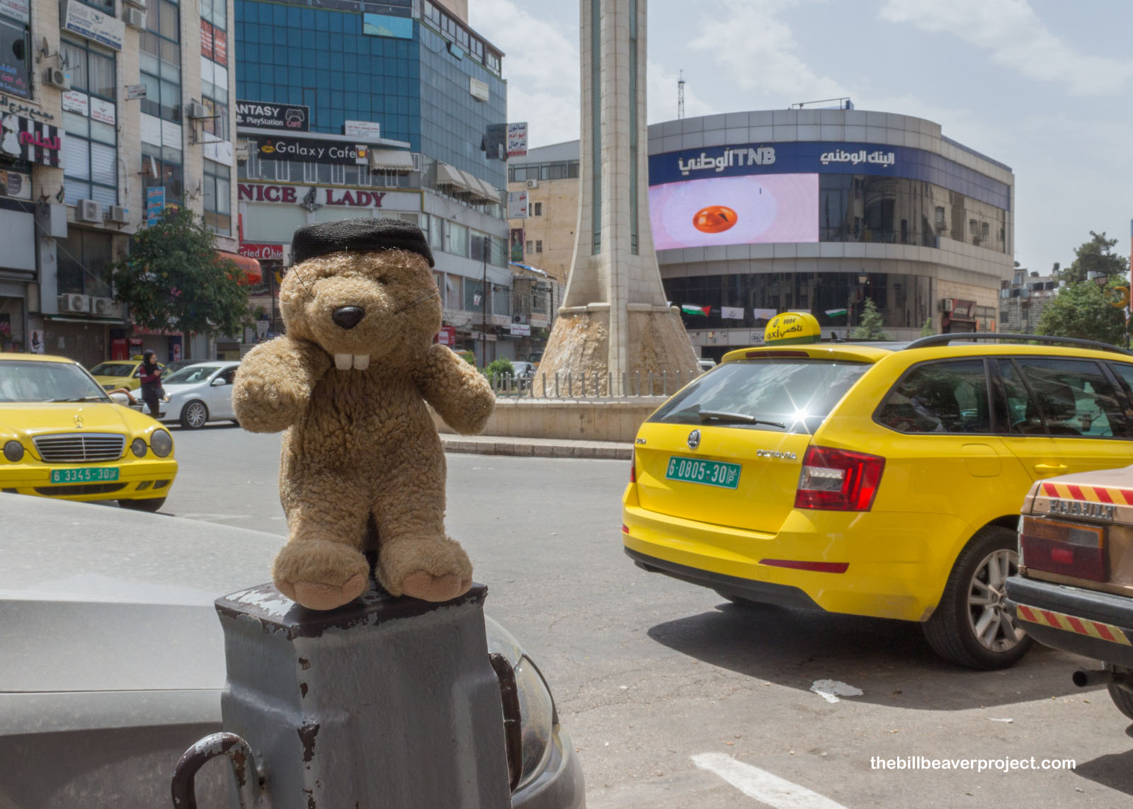 We paused at Al-Saa’a—Clock Tower—Square, one of Ramallah’s main meeting points. It’s also known as Yasser Arafat Square because at its center stands a tall monument depicting a boy raising a Palestinian flag. It’s meant to symbolize Yasser Arafat’s dream of spreading Palestinian autonomy across Israel. Karim just called it the Palestinian Times Square, because like New York’s version, it’s bustling with people, advertisements, and yellow taxis!
