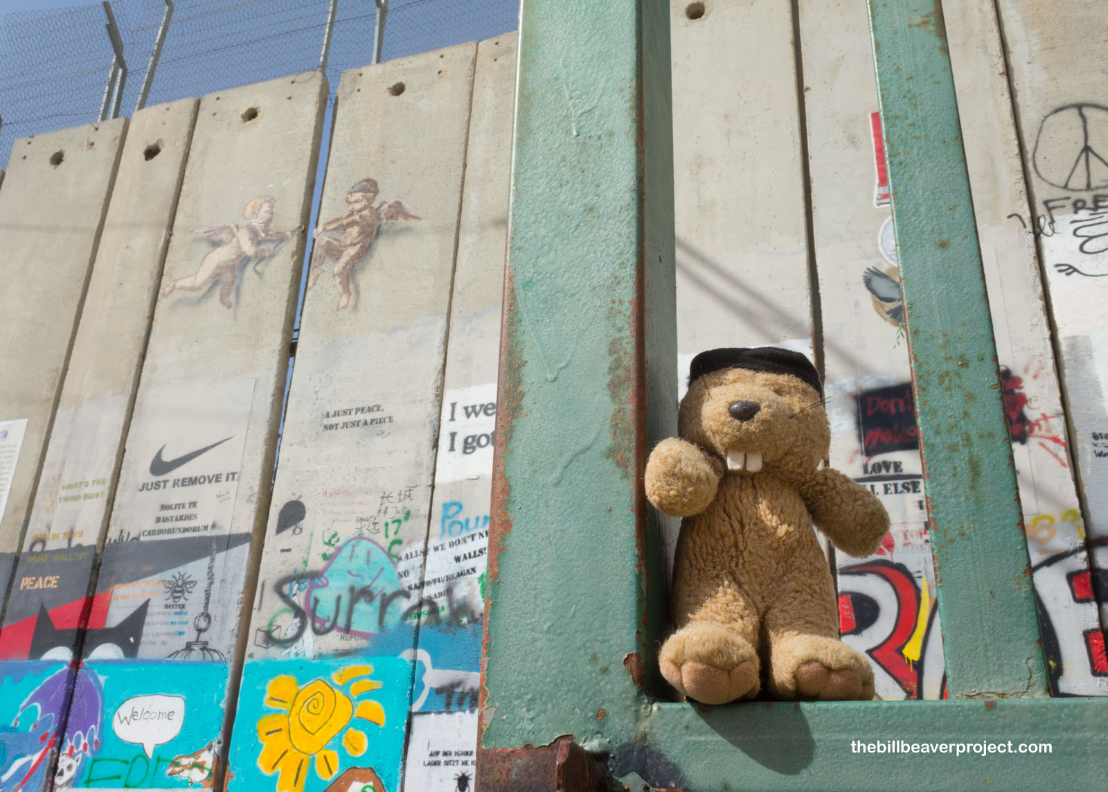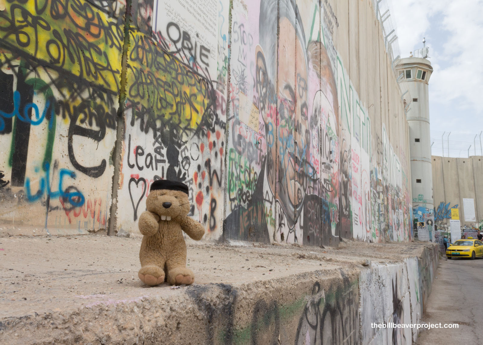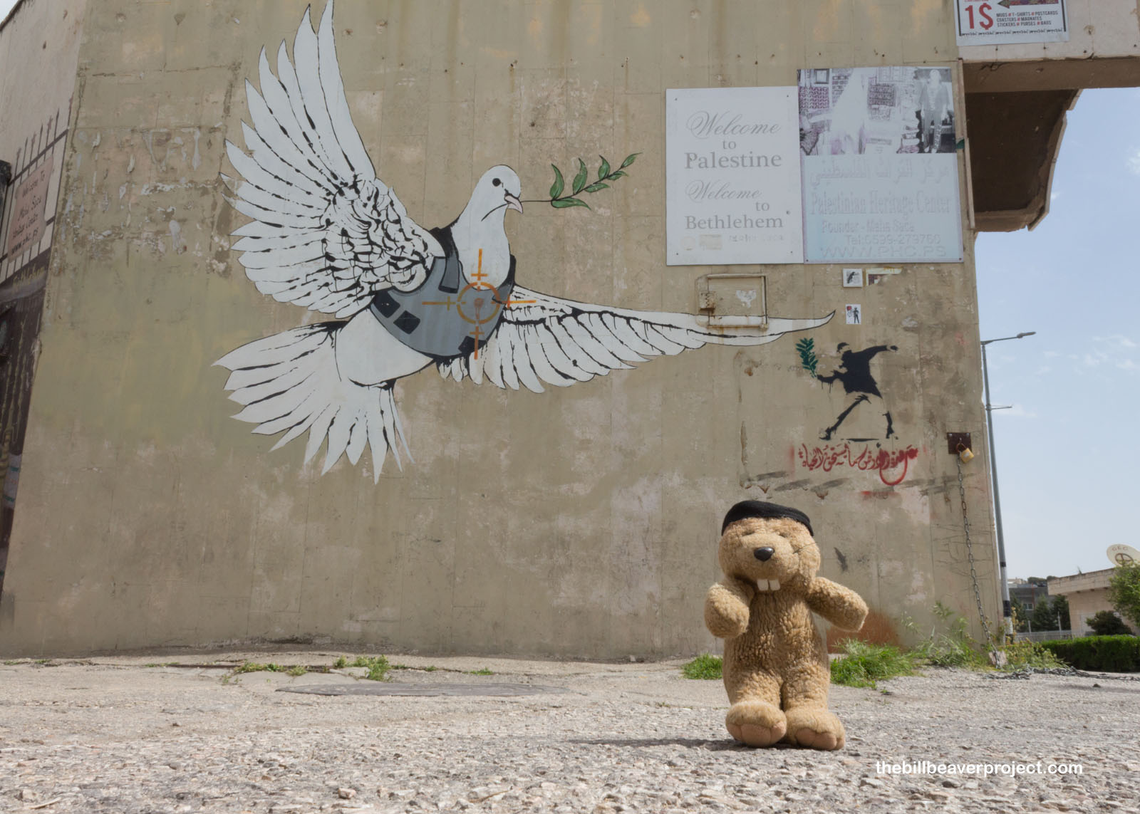 A lot of these frustrations now cover the base of the wall along Hebron Street here in Bethlehem. This stretch has become a very famous canvas of art, made so by the contributions of the artist, Banksy, who has combined traditional images of peace, like doves, cherubs, and even Dorothy from The Wizard of Oz with violent motifs from the Israel-Palestine conflict! In Banksy’s wake, countless other artists have descended upon this wall with messages of peace, of provocation, of questions. In fact, there’s even a shop here that helps visitors make their own stencils and spray-paint their messages onto this international canvas! The process is described as not not legal!