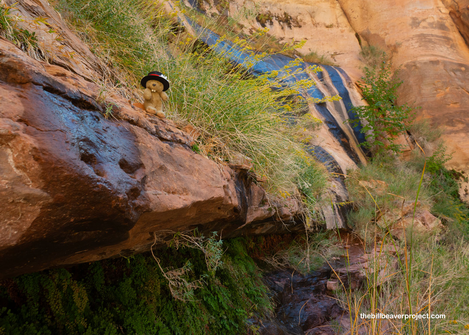 As the water leaches out of the rock, it carries minerals with it, like iron oxide and manganese! These leave black streaks down the red sandstone called desert varnish, which really added to the tapestry of reds, browns, and greens coming into the canyon today!