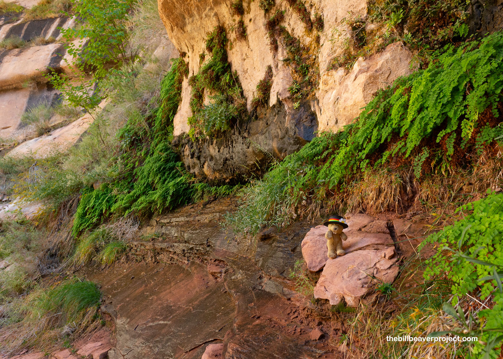 But not all of the original life has been drowned or crowded out here. About halfway up the trail, I came to a lovely hanging garden, fed by a spring trickling right out of the rock! There were native grasses and trees, and lots of maiden-hair ferns making the most of this cool oasis in what’s otherwise a pretty parched desert!