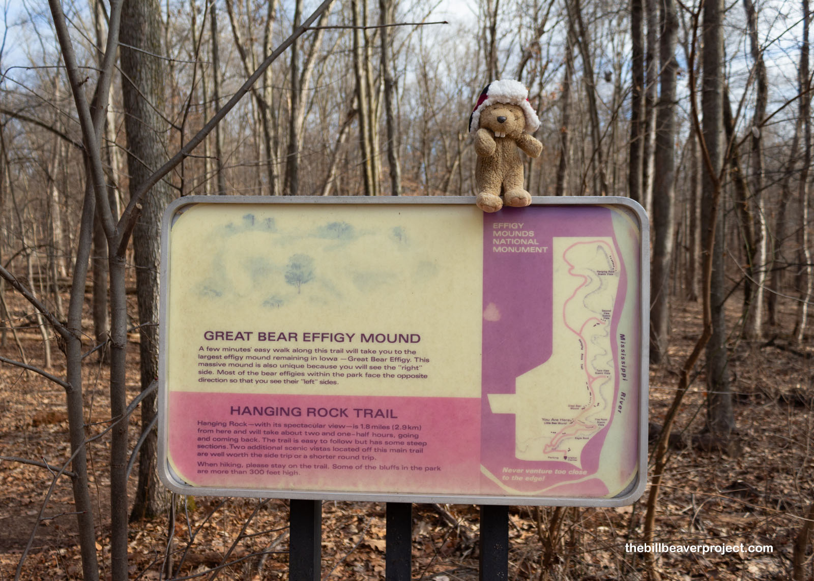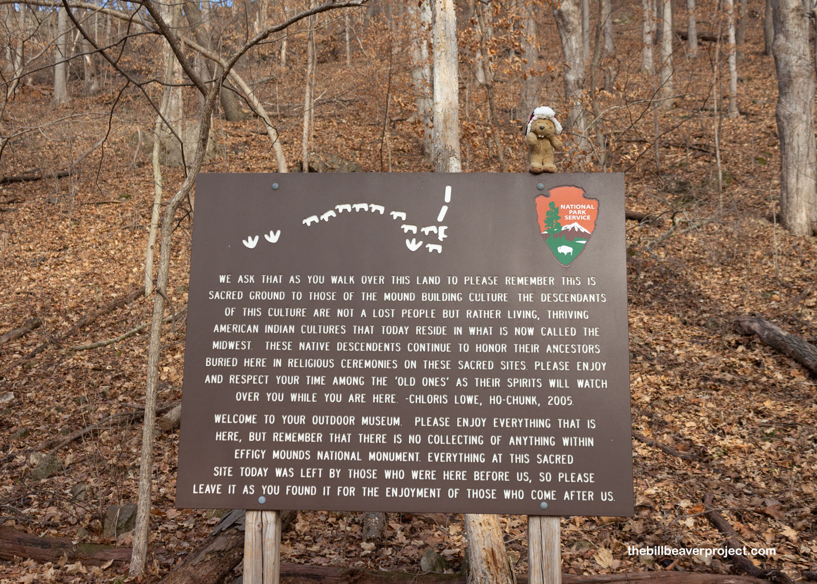 As many adventures do, this one started at a trailhead with an introduction to what I was about to see. Northeast Iowa and the bottom half of Wisconsin make up the Effigy Mound Region with over 10,000 known earth mounds shaped like bears, lizards, turtles and more! This area has one of the largest concentrations of these mounds, with 206 of them dating back to the Late Woodland period (roughly 500 BCE to 1100 CE), some for burial, some for ceremonies, all still sacred to their descendants, who now span twenty different tribes!