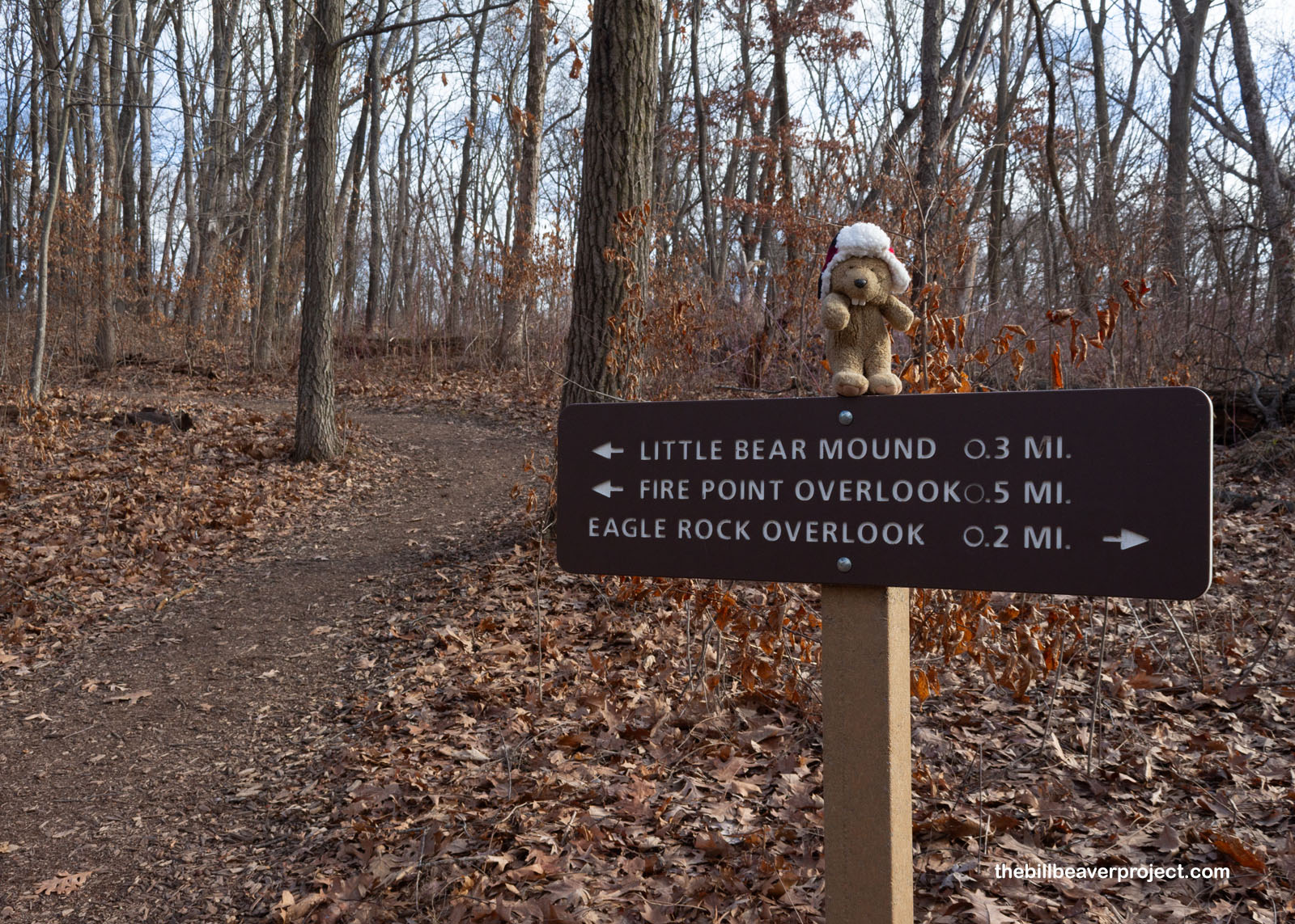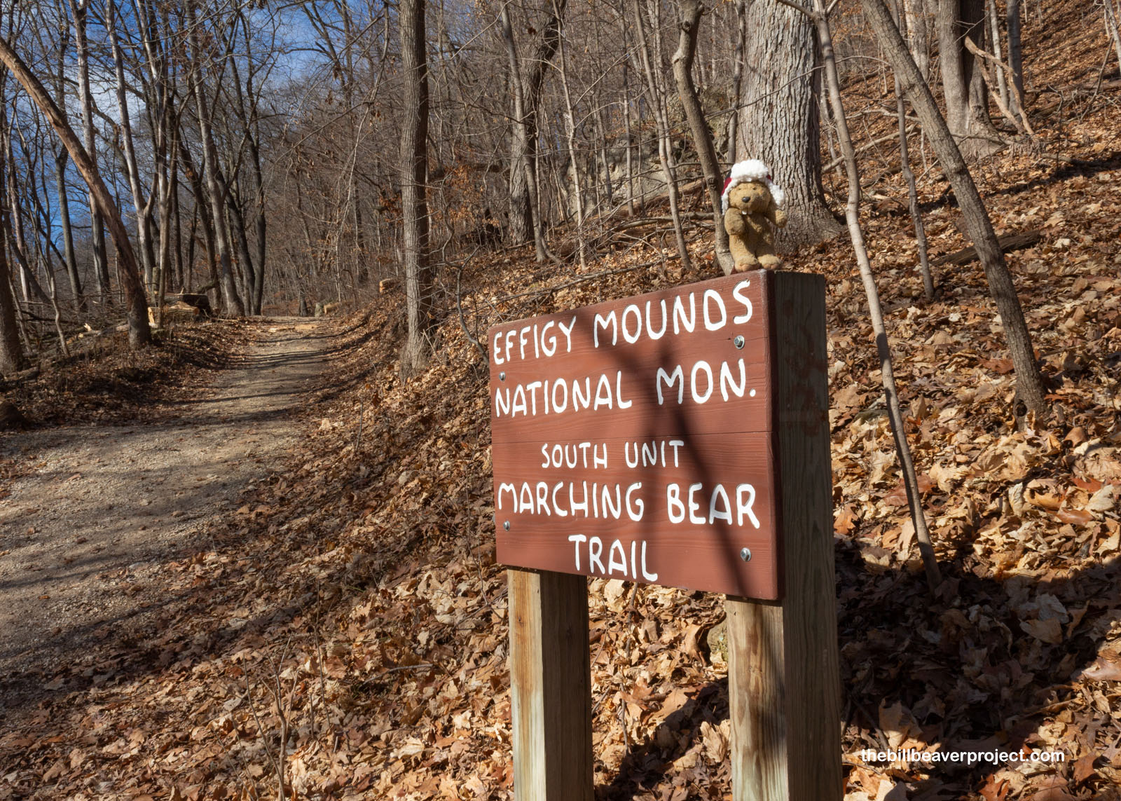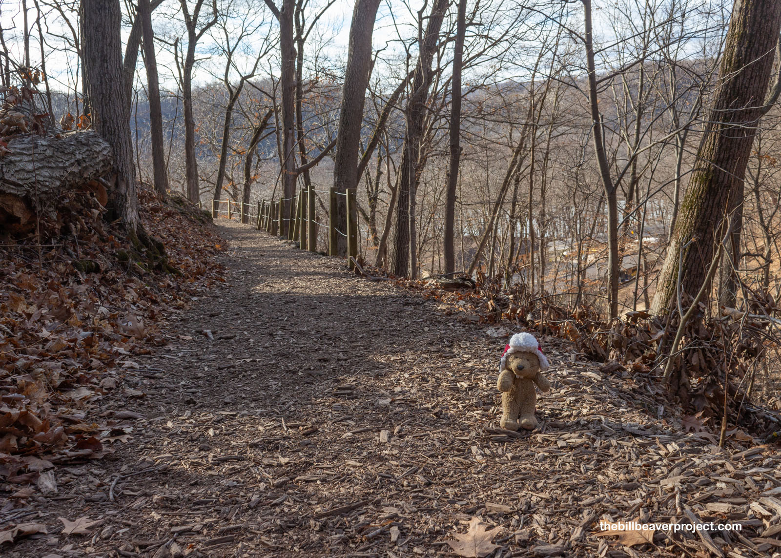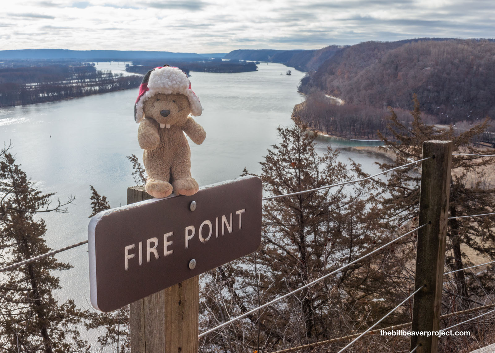 At the end of the loop was the Fire Point lookout, certainly not the most fiery at this time of year! From here, I could see out across the mighty Mississippi River into the snowy state of Wisconsin! It looked super cold over there, even though it was less than a mile away on the exact same day, but it was also super pretty! I’d been on the fence about crossing that state line on this trip—literally!—but if I could get to the Marching Bears and back fast enough, I might have just enough time to set foot in the Badger State! I hustled back down the Fire Point trail and made my way to the park’s South Unit!