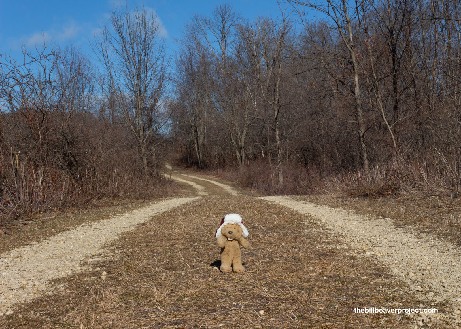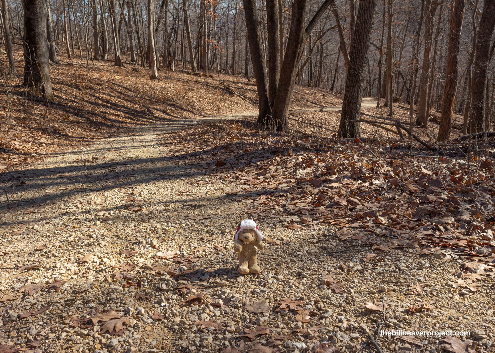 The trail was more of a road than an actual trail, gently rising up through the woods and getting downright toasty toward the top of the slope! I’d started the day with fall, looked across the river to winter, and now felt like spring was turning to summer! Maybe it was because I was hustling so much in my very warm hat!