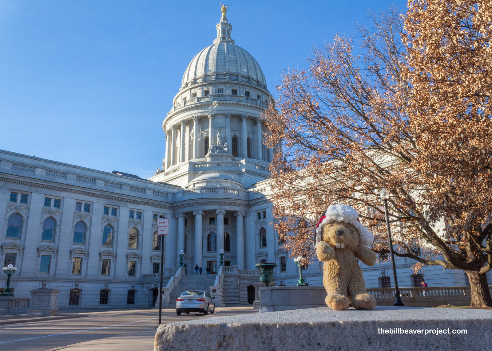 I strolled the Trollway at both the best and worst possible time, because today, folks were celebrating their annual Scandihoovian Winter Festival, strolling about in red, cone-shaped caps like Scandinavian little folk (nisse in Norway and Denmark and tomte in Sweden)! While these creatures technically aren’t trolls, that didn’t stop folks from enjoying a midwinter’s activities, like a spelling bee for adults, broom ball on Stewart Lake, and frozen turkey bowling at the local skating rink! I should have blocked off a full weekend for that, but this was a split-second dip into Wisconsin, and I still had to see my 46th capitol building!