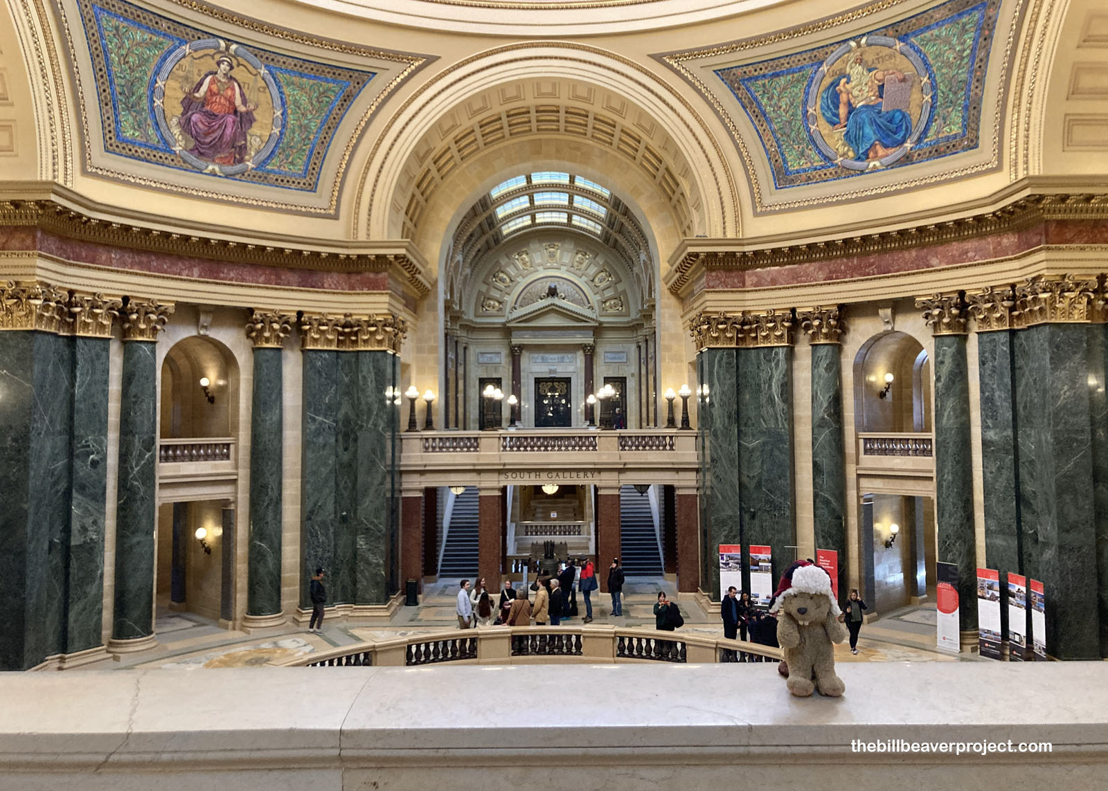 Inside the rotunda really gave a sense of scope and scale with dazzling colors from the stone work to the four ornate mosaics by Kenyon Cox, which represented Legislation, Government, Justice, and Liberty, but to me made the space feel more at home in Istanbul! And of course, I couldn’t miss the badger sculptures on the walls at each of the cardinal directions! Wisconsin became the Badger State because of its lead mining industry. Lead miners were so poor that they often lived in the mines they worked, so non-miners teased them by calling them badgers! The name really stuck!