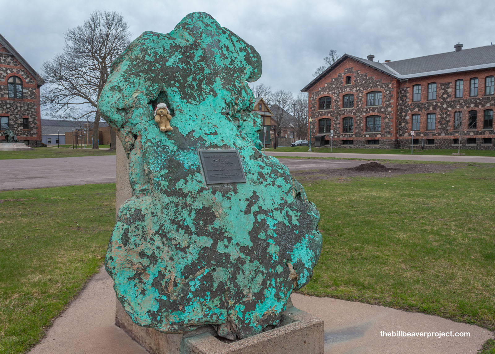Regardless of how I stumbled over its pronunciation, the towns along the Keweenaw Peninsula make up a patchwork of historic sites collectively known as Keweenaw National Historical Park, which tells the story of the nation’s first copper boom! Right at the entrance in the city of Calumet, I was greeted by a monumental boulder of copper, 9,392 pounds of it! Called “float copper,” these hunks of metal were dislodged from their veins by glacial movement, smoothed, rounded, and then buried. This one was dug up on 1970 after roughly 9,000 years oxidizing underground!
