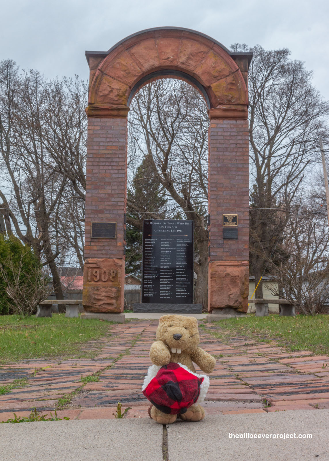 The gray skies made things a little somber, especially as I made my way to one of the park’s most recognizable memorials: site of the Italian Hall tragedy! Three years after Mr. Agassiz died, the workers of Calumet were able to organize and strike for better wages and working conditions. On Christmas Eve, 1913, hundreds of folks gathered on the second floor of Italian Hall for a party, and someone yelled “Fire!” In the ensuing stampede, 73 folks died, over half of them children, and while no one was officially prosecuted, it’s suspected that company officials had barred the doors and facilitated the stampede!
