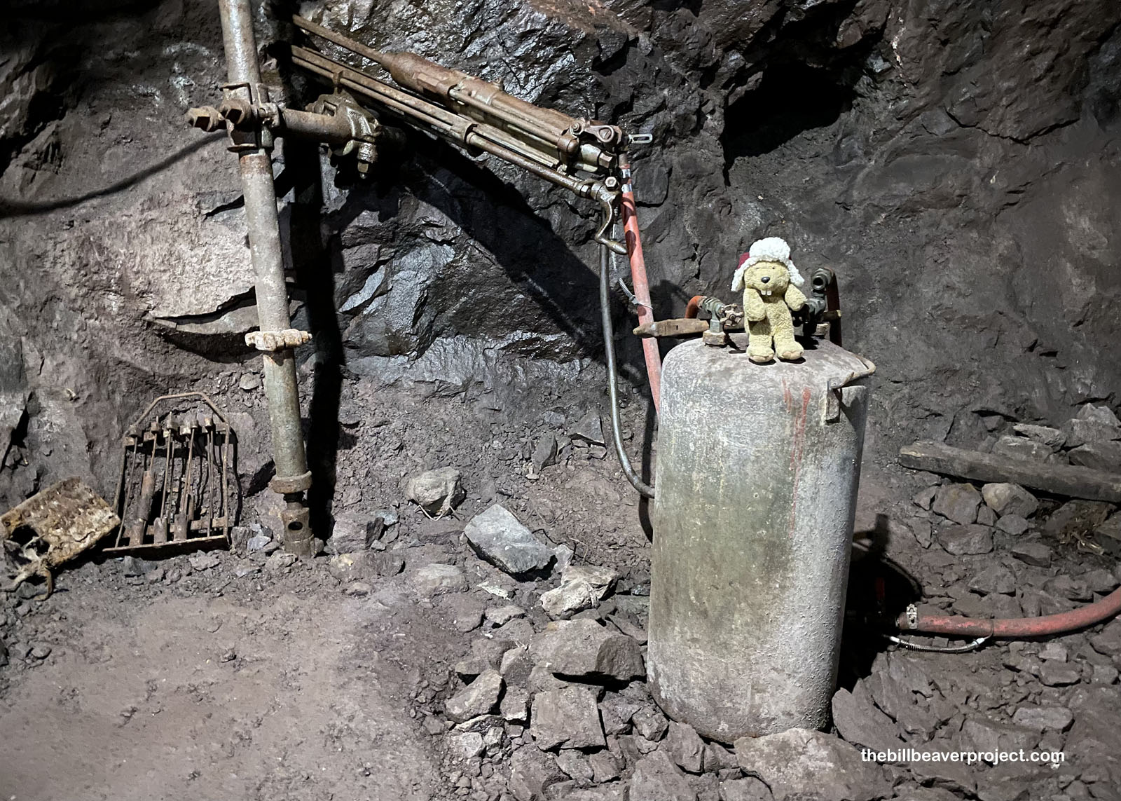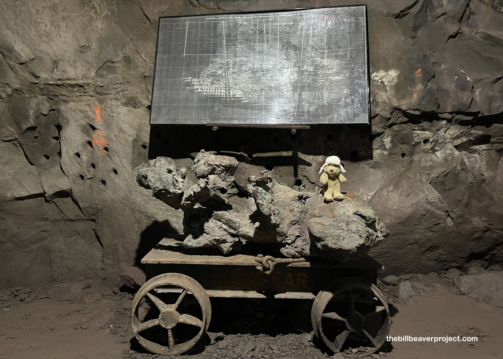 Just as we approached the end of the line, the perfect illustration! Up top is a map of the mine’s many, many levels! Down below are some huge chunks of the ore that the miners would push in carts down long tunnels to the hoist! This could only be done after a trio of them had taken turns by candlelight holding then hammering an iron spike into the rock (made my paws hurt just thinking about it) to be filled with a stick of dynamite!