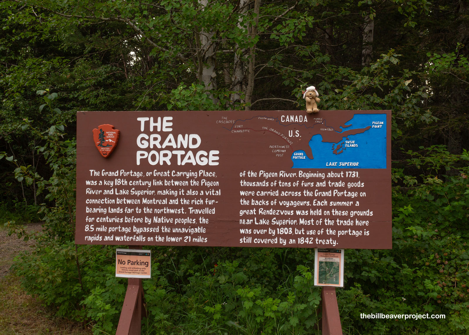 There wasn’t a lot to see here! There was a sign welcoming folks who had canoed here all the way from the Boundary Waters or as far as Voyageurs National Park, as well as a campground with picnic tables and fire pits. But back in 1789, this was a bustling British trading post called Fort Charlotte, the counterpart to Fort George at the opposite end of the Grand Portage. Even though the portage was made famous by the French voyageurs who’d traversed the Portage for thirty years, the Seven Years’ War had put all of Canada under British rule by 1763! At this fort, the plunder of the inland wilds arrived by canoe to be sorted and packed out on foot, but it didn’t survive long past the turn of the 19th Century!