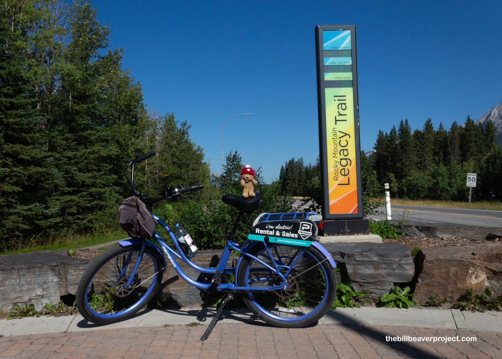 Though the first day of our adventure was pretty utilitarian, our second day dawned bright and shiny. Today, we were going to stretch our legs by renting some e-bikes from Pedego Electric Bikes Canmore, something I’d never done before! Unlike regular bikes, these ones have buttons that give you an electrical boost when you need it, and I suspected I’d need it on the 26.8-kilometer Legacy Trail connecting Canmore with Banff! Biking this trail is a super popular activity. How popular, you ask? Well, the sign at the trailhead counted folks as they passed! 186 bikers had already beaten us to the trail today, with 65,362 riding the Legacy Trail this year! Well, there was no point in dawdling and looking at numbers. There was wild beauty to experience!