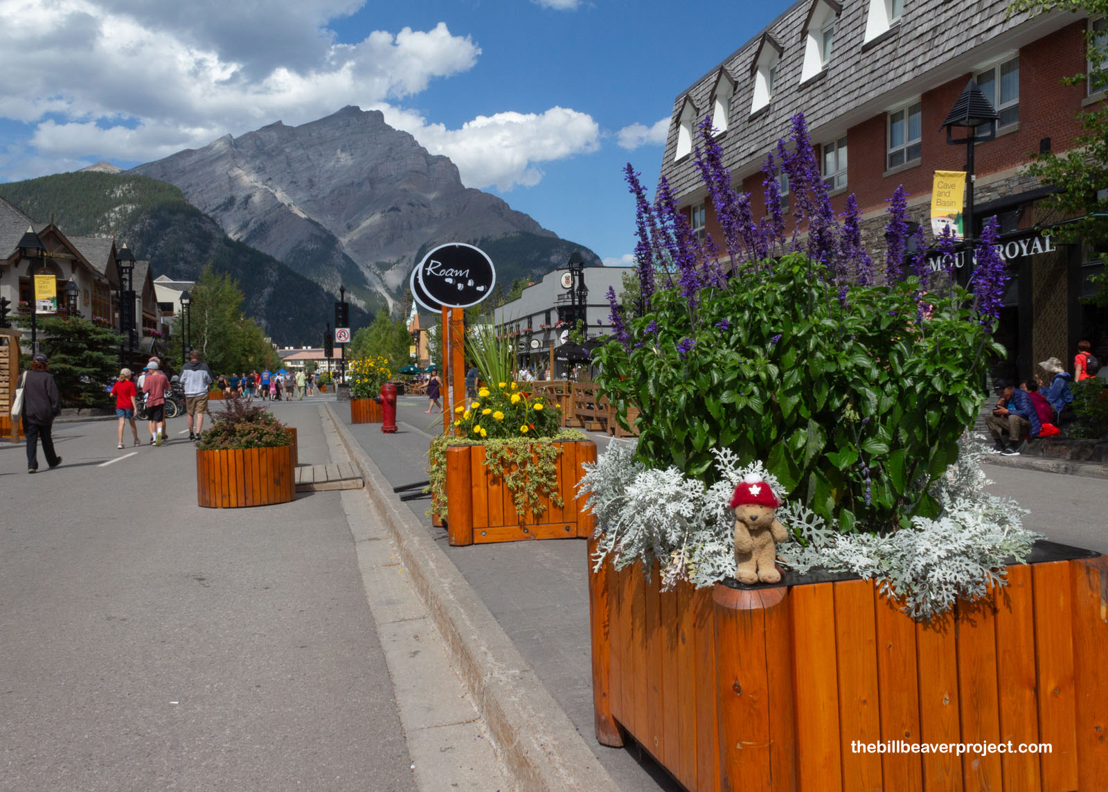 Another twenty minutes of riding, and I just had to call out a time-out. Cascade Mountain was up ahead, reflected magnificently in a little stream off the side of the trail, just as that trail was nearing its final left turn into the range’s most famous town: Banff. After enjoying the view, we got back on our bikes and followed our hunger into Banff, crossing some surprising animal barriers. They were electrified, designed to zap any bare-footed (or bear-footed) critter trying to cross them! I sure was glad to be on a bike, because my toes might never have recovered!