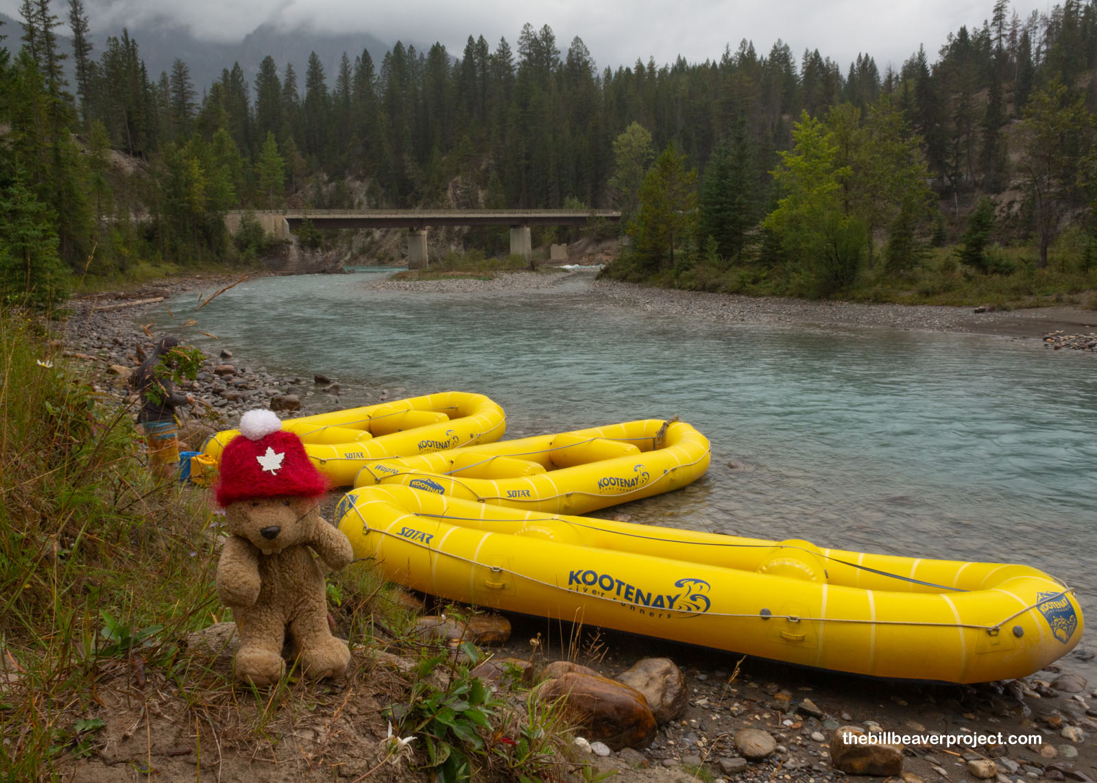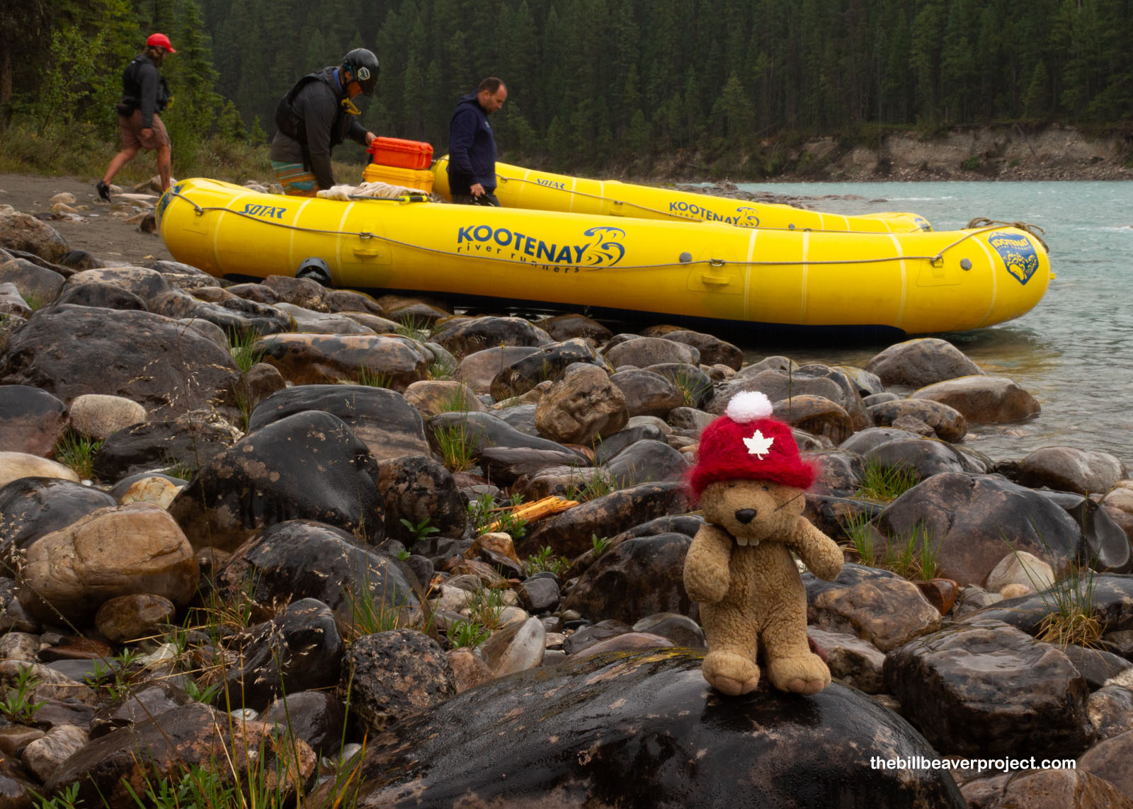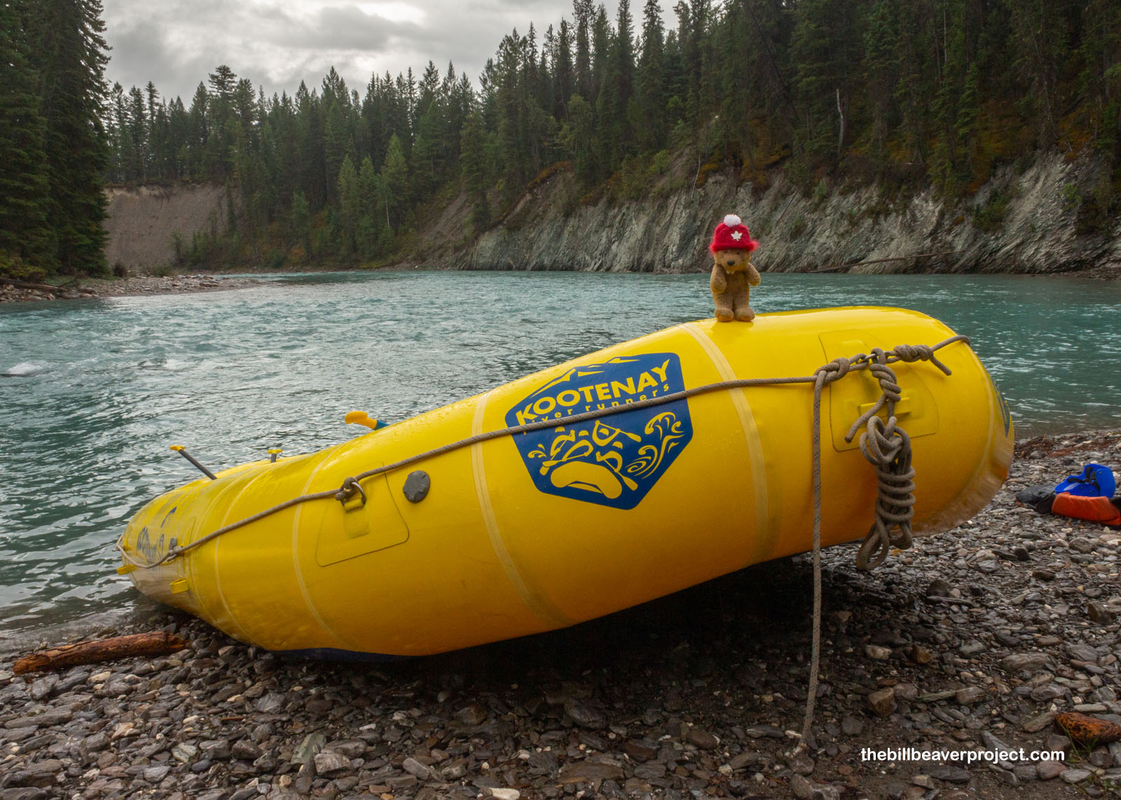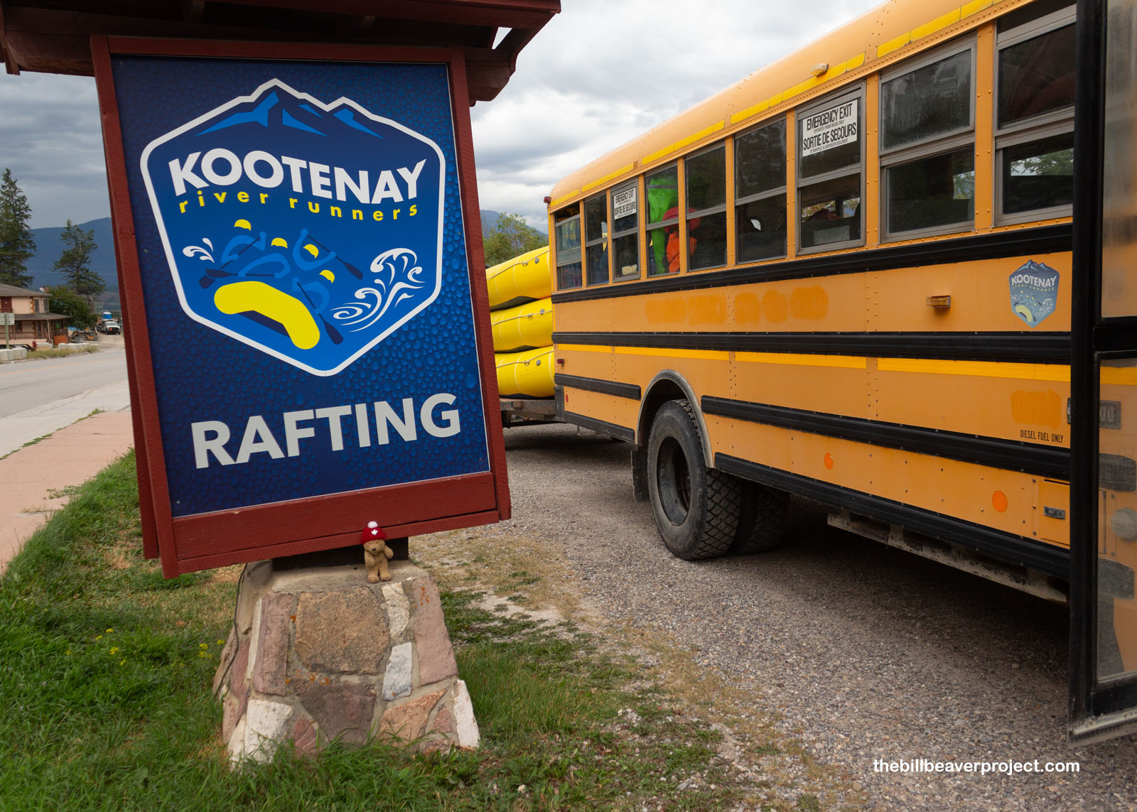 Today, the forecast is nothing but clouds and rain, so we’ve made the decision to get real wet! Motoring out of camp, we headed into town, where two school buses were lined up in front of Kootenay River Runners, ready to take a whole slew of folks on a rafting adventure!
