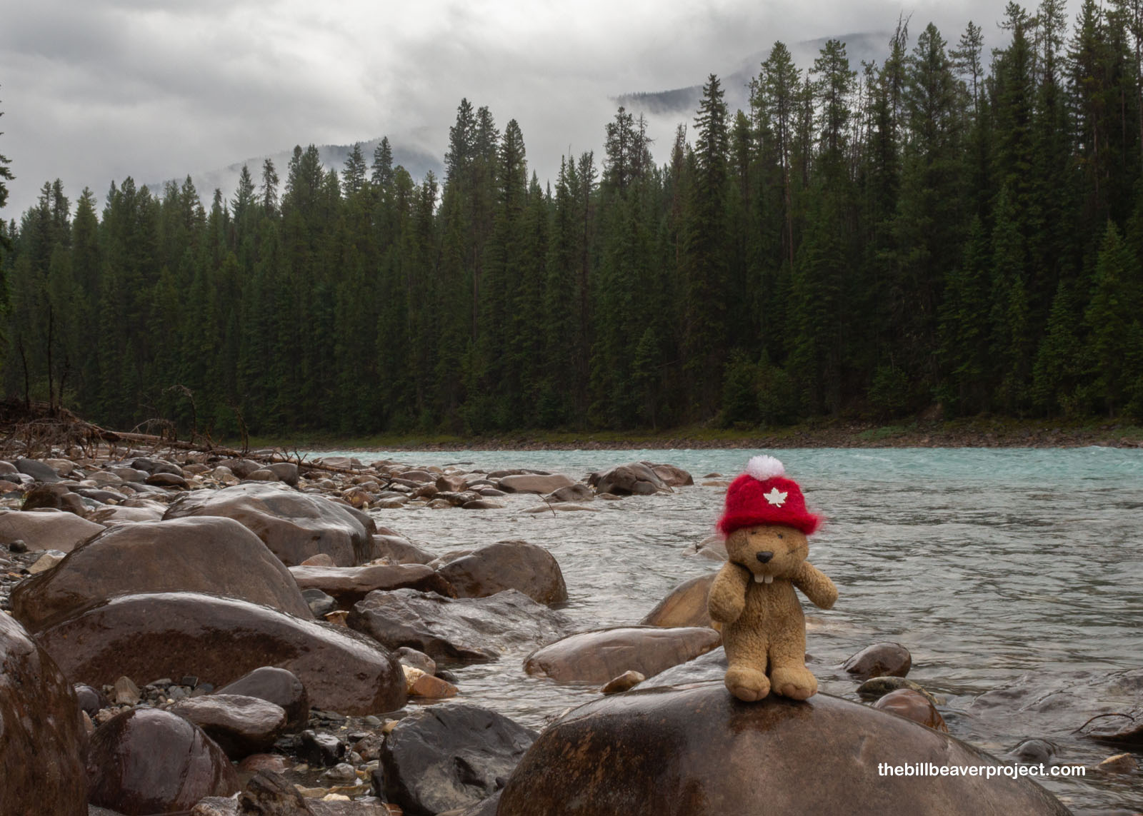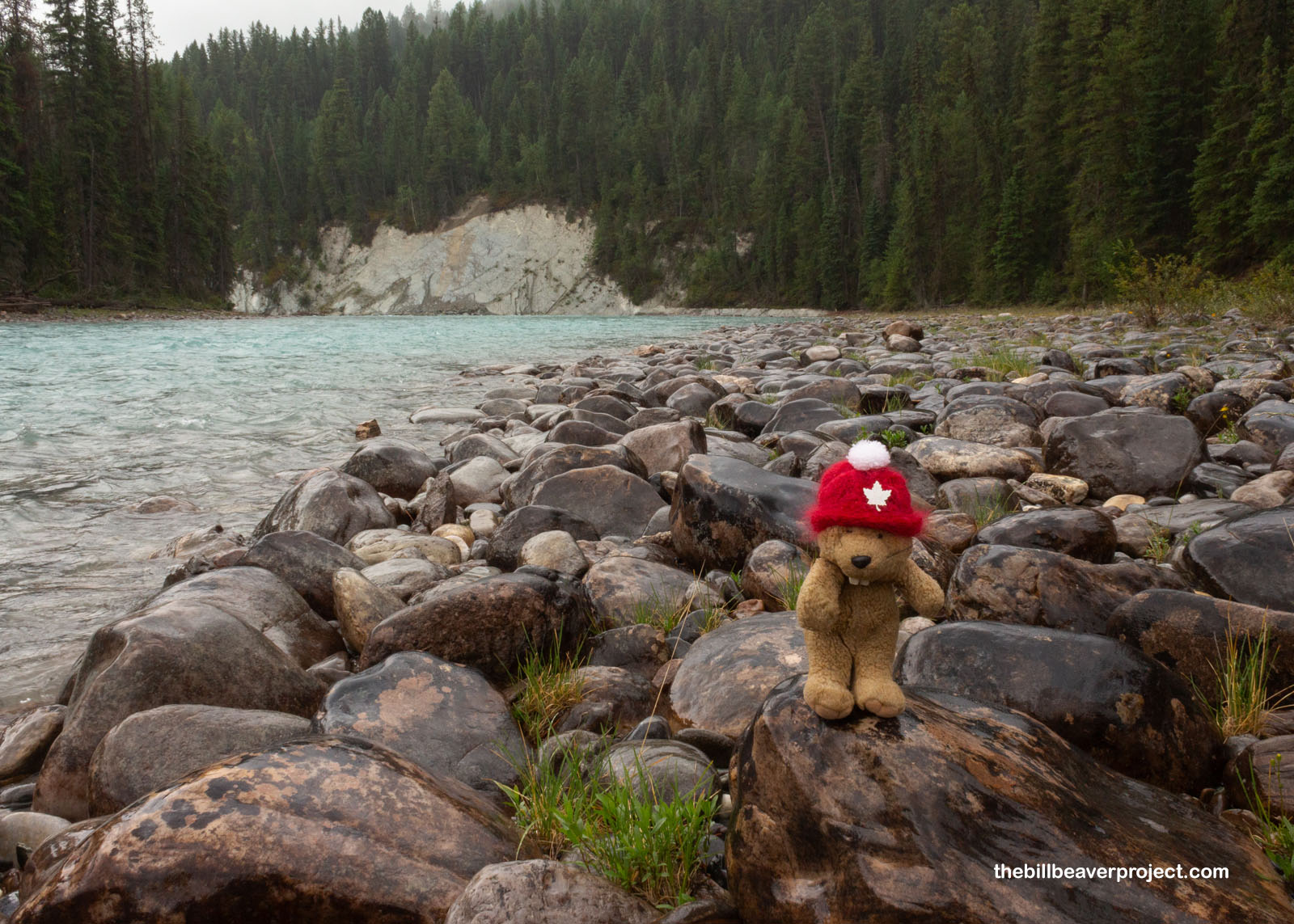 To get to the launch point on this bright blue river, we headed about 25 minutes north of Radium Hot Springs and cut in on a super muddy, wildly bumpy dirt road, really a mud road, for about twenty minutes! Since that particular road was shared by a magnesite mining company, we had to pull over and let some trucks pass a few times, but that gave us a chance to hold a piece of magnesite and learn about this rare mineral deposit, one of the purest in the world! Magnesite isn’t named for any kind of magnetism but for being a magnesium ore! It doesn’t hold heat, which makes it valuable for lining hot water pipes, and its magnesium content makes it useful for fertilizers, fiberglass, and even vitamins for livestock feed! Anyway, shortly afterward, we all unloaded from the buses to stand in the rain and assemble our whitewater equipment!