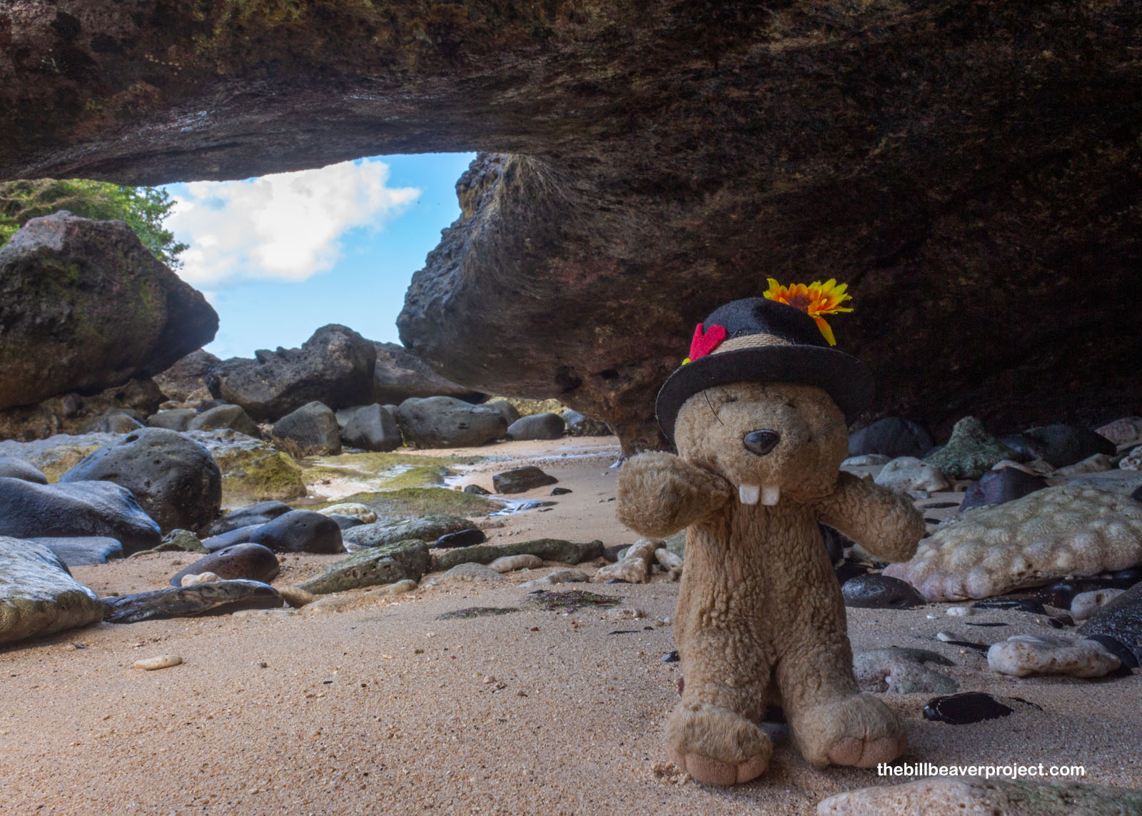 I slid through a sea cave full of seashells and coral that had been smoothed by the waves to look like chunky pancakes. In here, I was very glad the tide was low, because I’d have been smashed into a pancake myself! Instead, I just got to see some really neat views of the island through the cave’s opening!