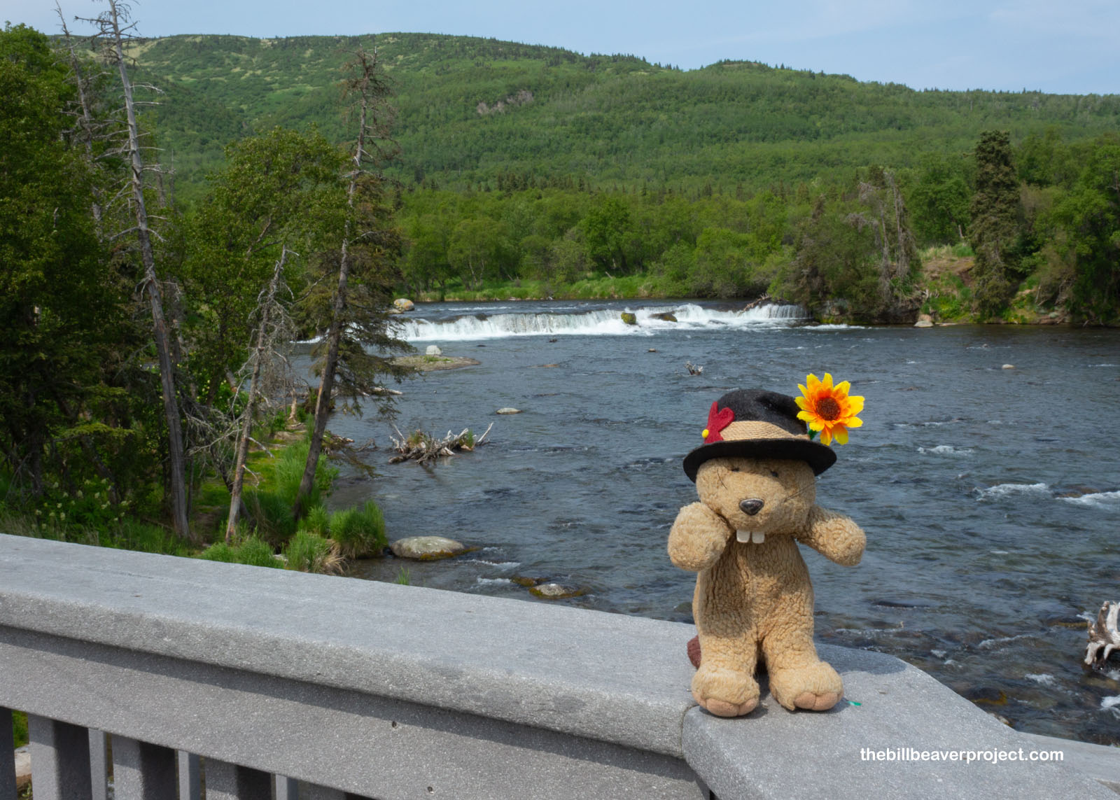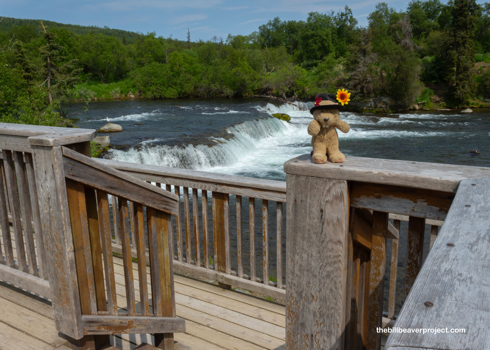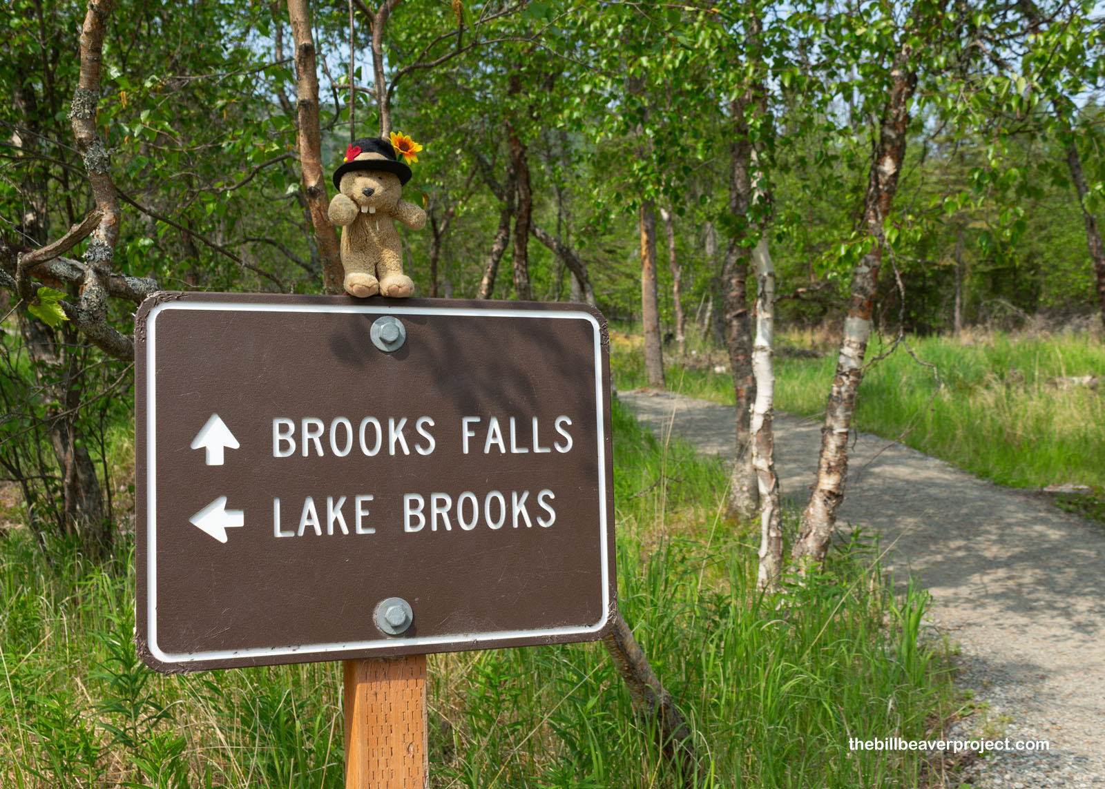 Past the gates at the other end of the boardwalk, I had a short jaunt up a dirt road, past the van that normally takes folks on driving tours of the Valley of 10,000 Smokes, until I spotted the branch trail leading to the Falls, where there were no boardwalks, gates, or fences to separate me from a beaver-hungry bear. The trail sign warned all would-be hikers that the park could not guarantee anyone’s safety! I took that to heart and hustled, keeping my ears and whiskers primed for danger!