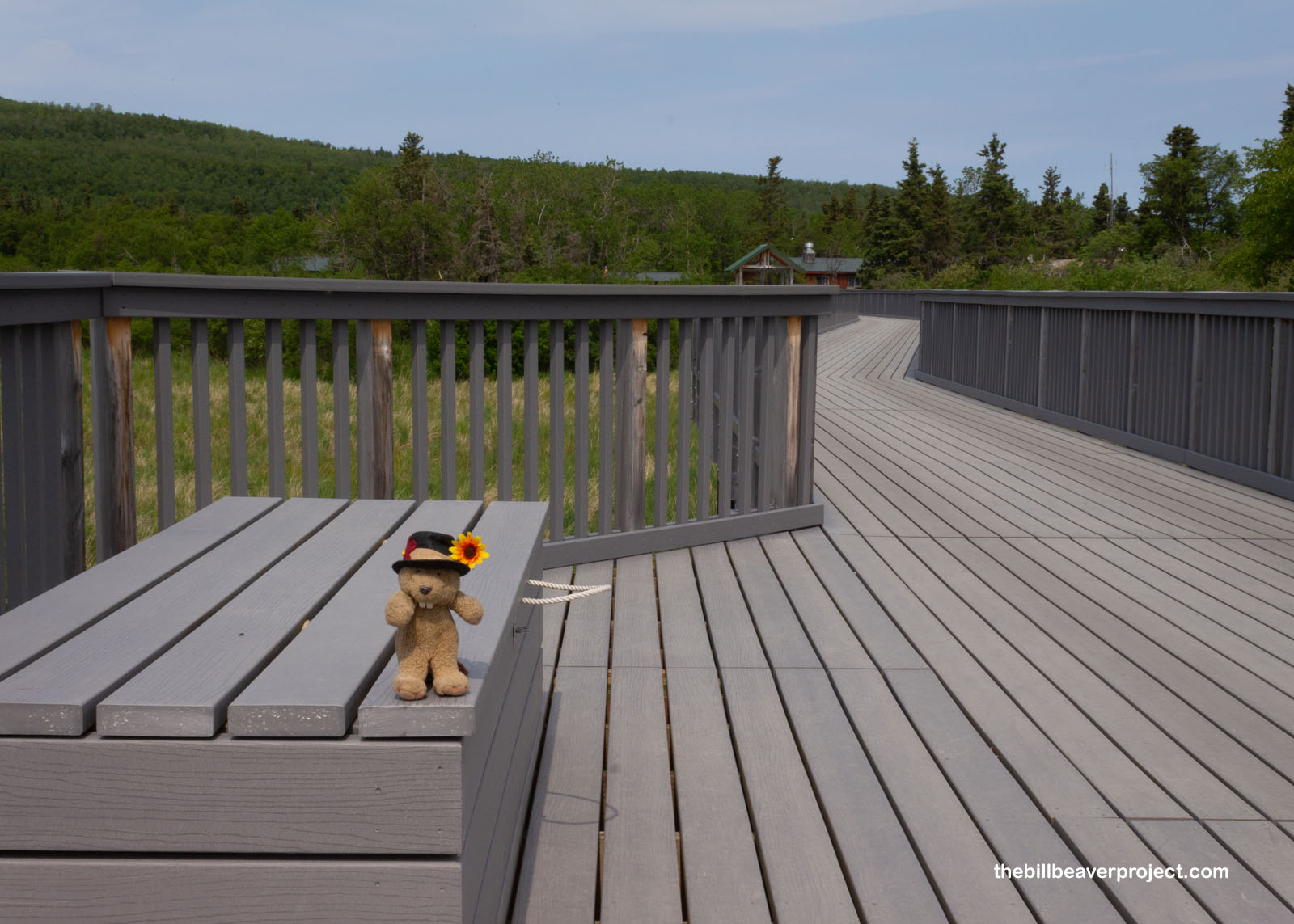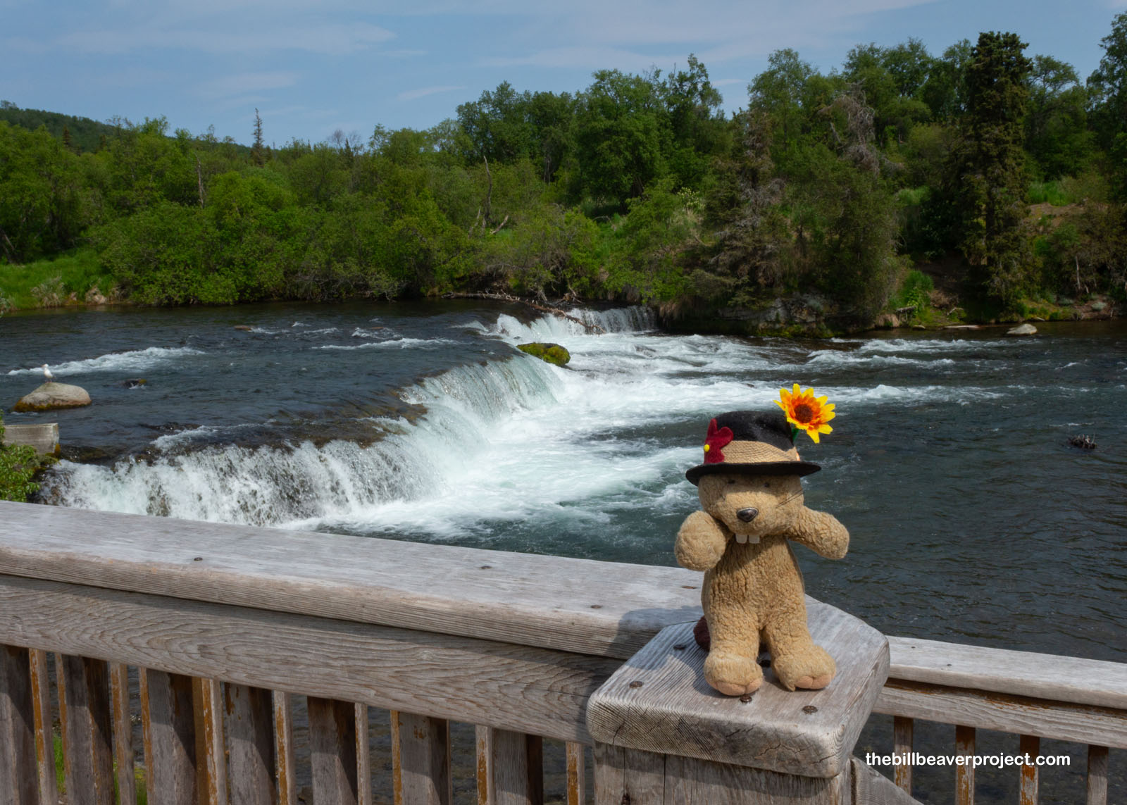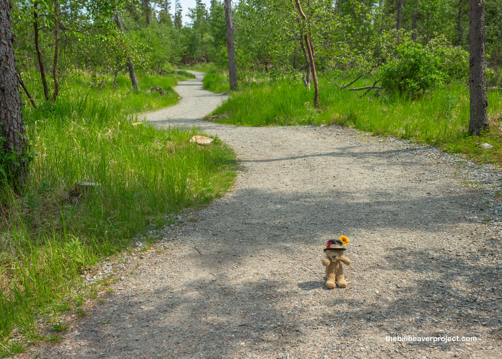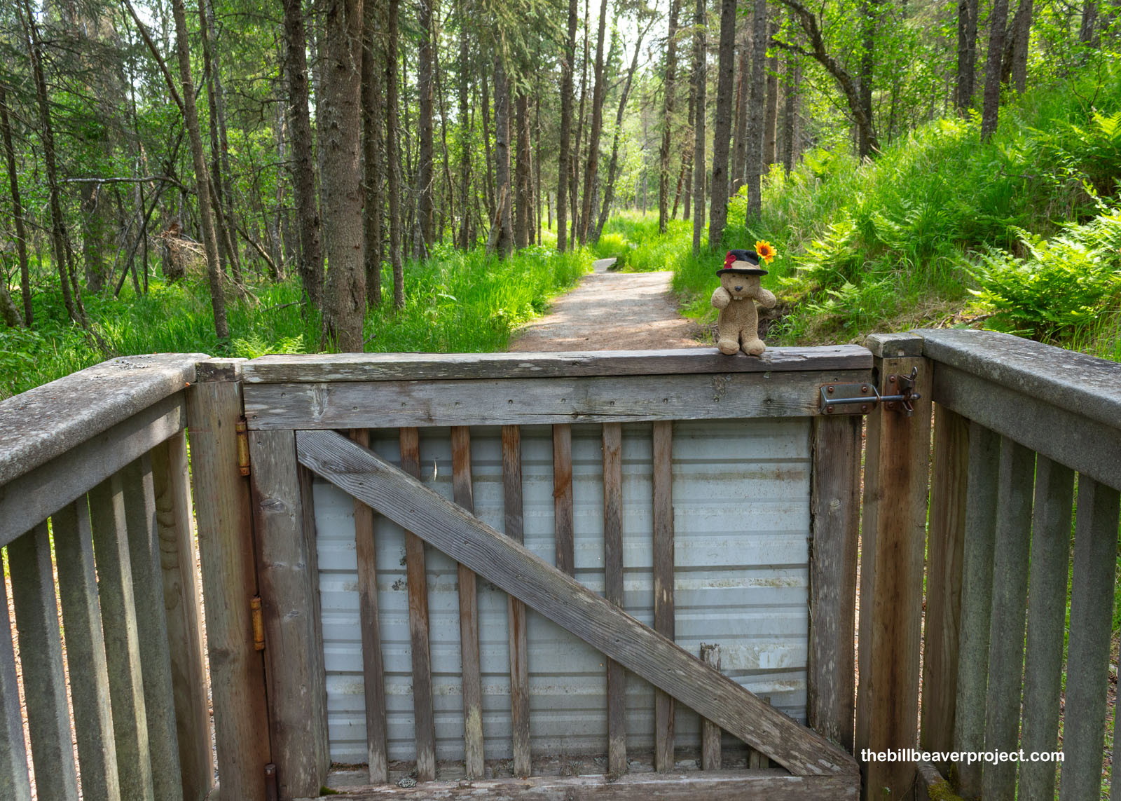 Past the gates at the other end of the boardwalk, I had a short jaunt up a dirt road, past the van that normally takes folks on driving tours of the Valley of 10,000 Smokes, until I spotted the branch trail leading to the Falls, where there were no boardwalks, gates, or fences to separate me from a beaver-hungry bear. The trail sign warned all would-be hikers that the park could not guarantee anyone’s safety! I took that to heart and hustled, keeping my ears and whiskers primed for danger!